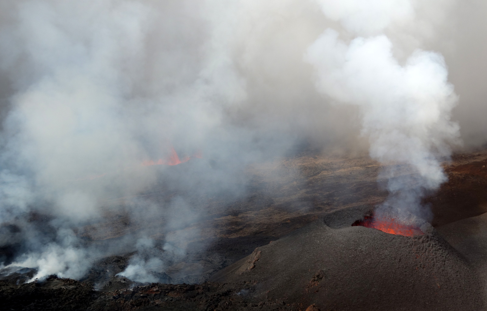 Boden auf und in kleinen Kratern auf dem Lavafeld blubbert die glühend