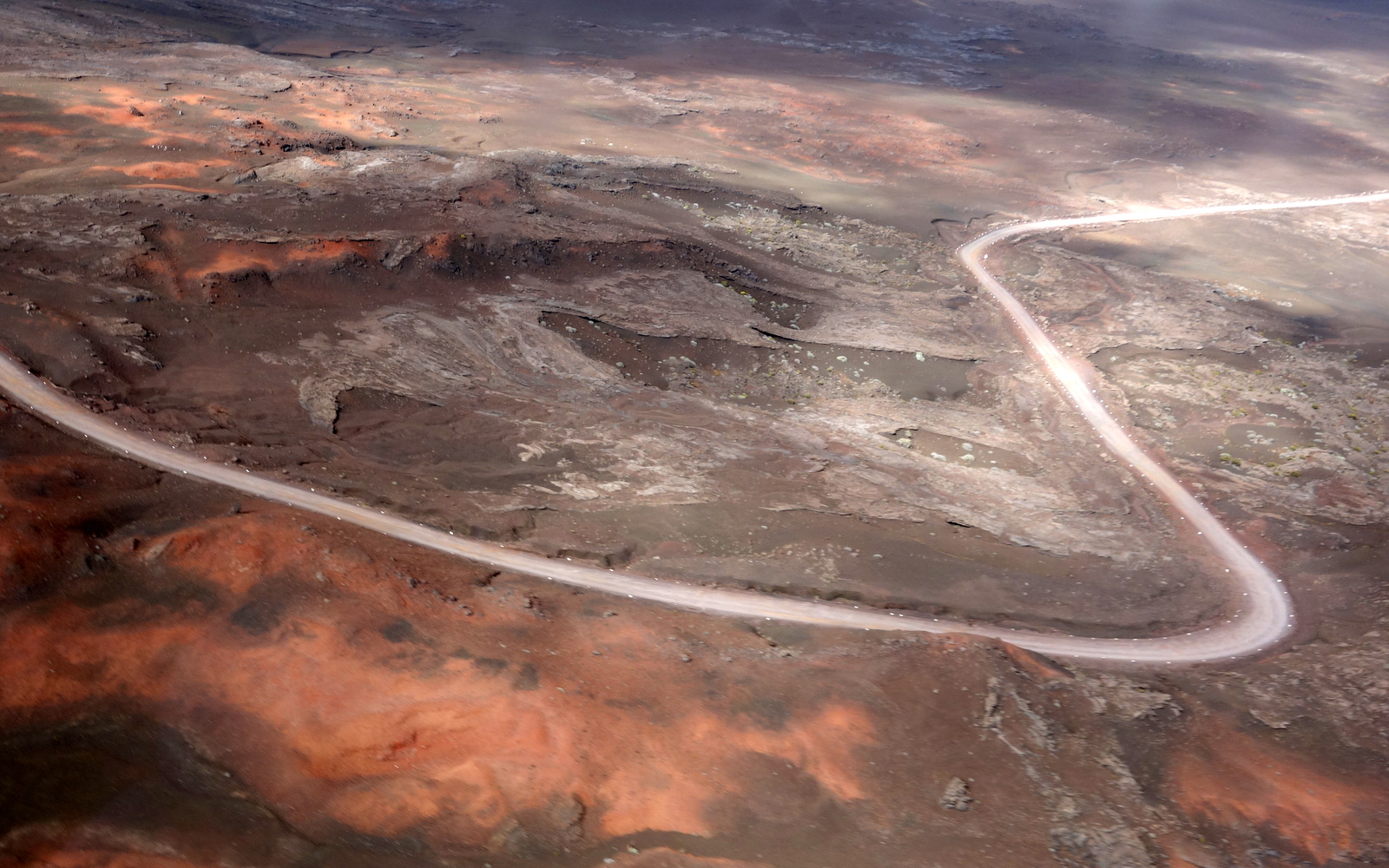Das war jetzt schon alles mehr als grandios, aber nun kommt noch die Sahnehaube oben drauf. Und die ist nicht aus Sahne, sondern flüssiges heißes Magma. 2600 m hoch ist er, der Vulkan „Piton de la Fournaise“. 2600m, das ist schon mächtig hoch. Insbesondere wenn man bedenkt, dass der Heli ja praktisch bei nahezu 0 m über dem Meeresspiegel gestartet ist. Und da unten, man kann es aus dem Kessel des Vulkanfeldes jetzt nicht sehen, hat der Teddy gestern noch gestanden, unten am Meer und har nach oben, auf das riesige erkaltete Lavafeld geschaut. Die wahre Höhe des Vulkans konnte ich dabei gar nicht erkennen. Dazu braucht man einen ganz anderen Winkel. Man muss auf das Meer raus, um überhaupt den Gipfel zu sehen, –oder eben hochfliegen.