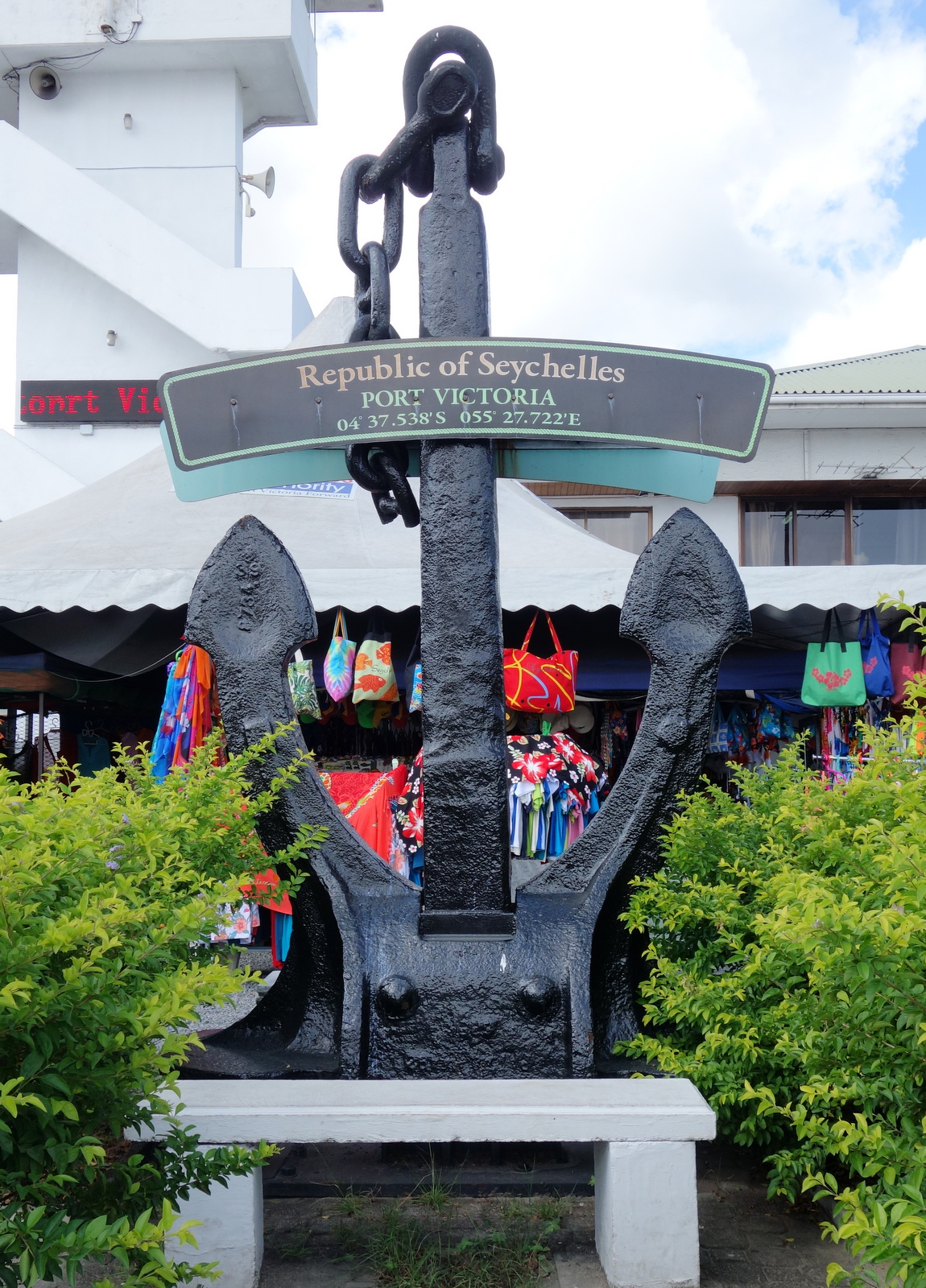 Die hier jedenfalls ist bewohnt – das ist Mahe, die Hauptinsel. Und wo das Schiff hier anlegt, das ist Victoria, – na ja, wenigstens fast. Wenn ich mich so umschaue, ist es eher ein Industriehafen und man muss schon noch ein bisschen laufen, um in die Stadt zu kommen - wenn man nicht gerade in einen Rucksack passt und getragen wird… Aber Mahe will der Teddy ja erst morgen so richtig besuchen.