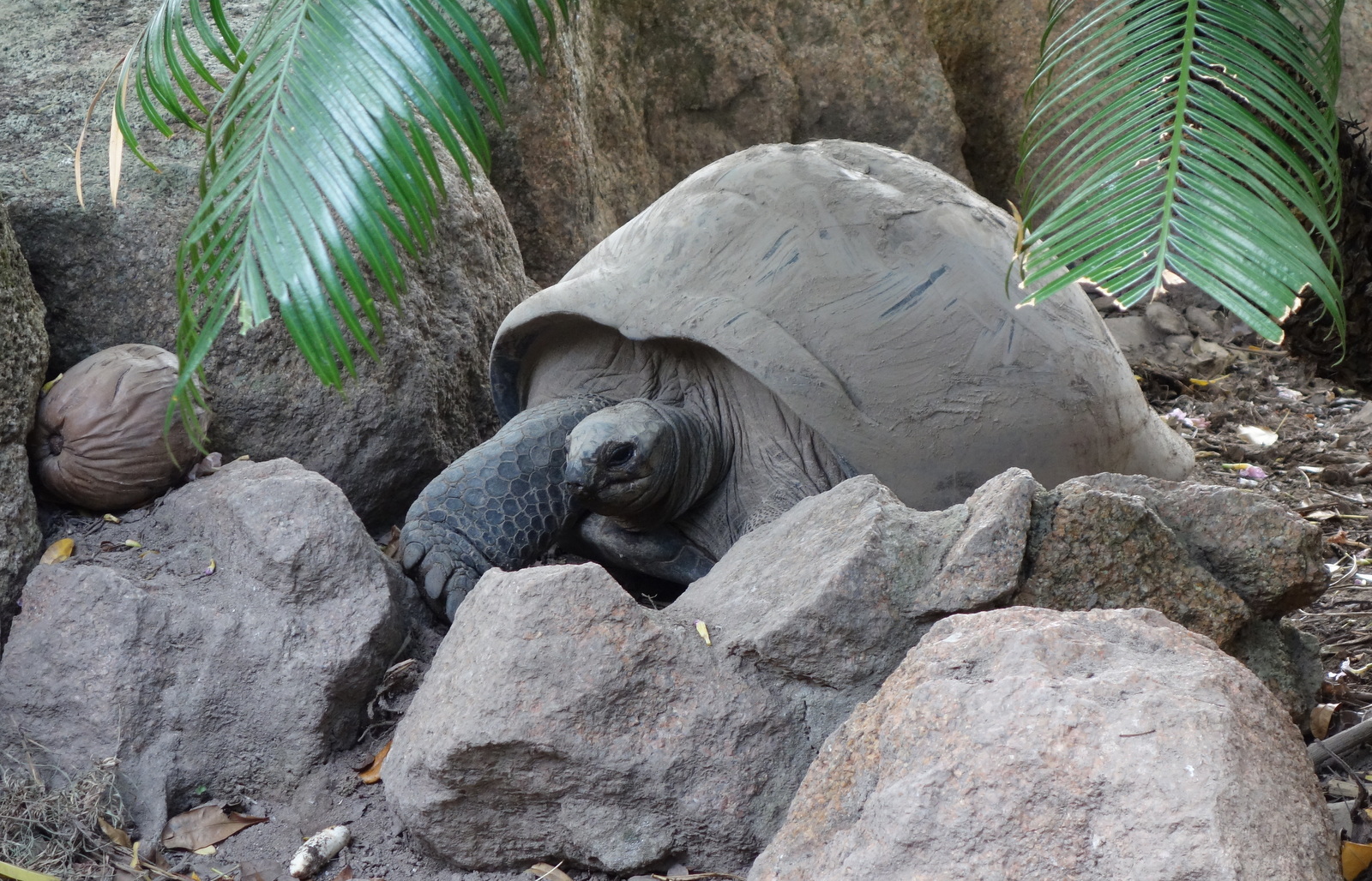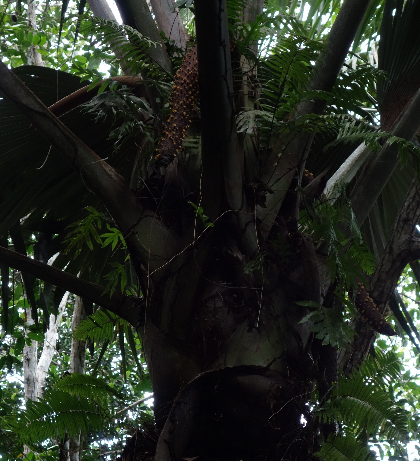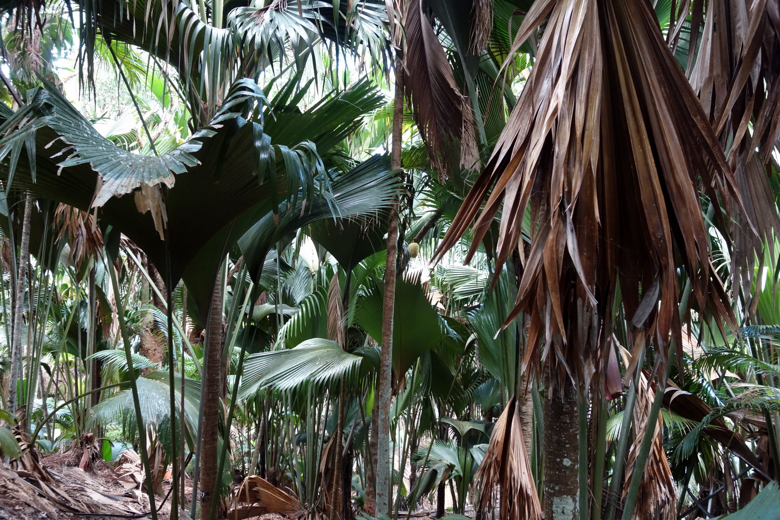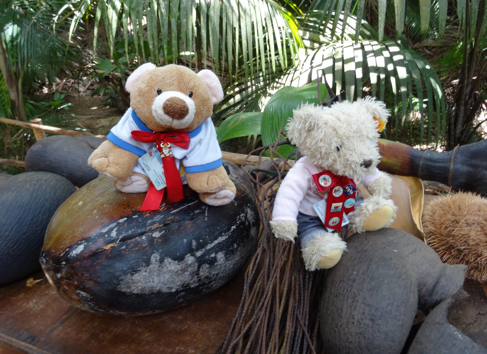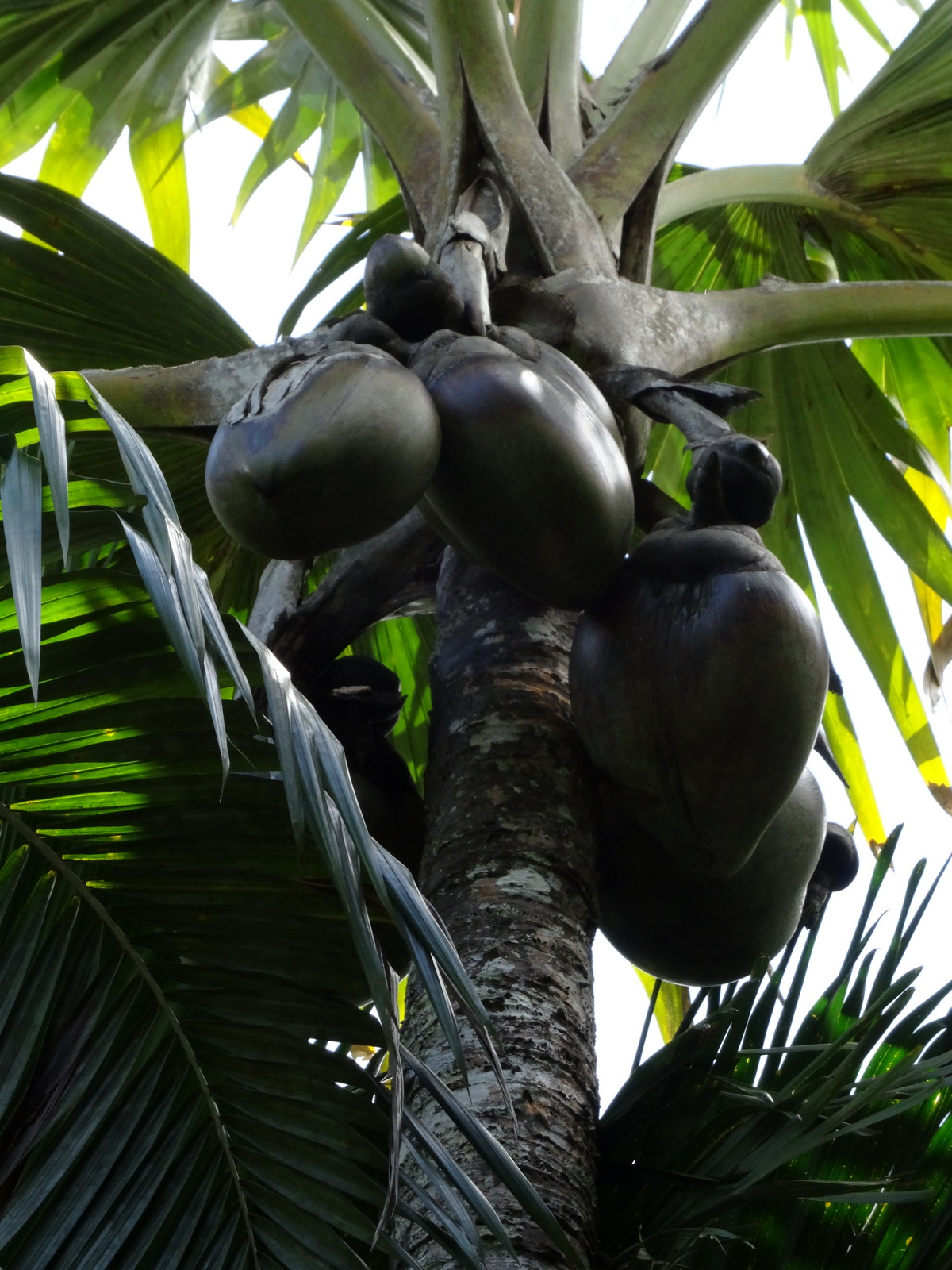 Heute gibt es sie wild wachsend, nur noch auf Praslin, wo der Teddy gerade mitten in der Botanik steht und auf Curieuse, wo der Teddy übermorgen sein wird. Die paar Exemplare im Botanischen Garten von Mahe sind gepfuscht, -die hat man da einfach hingepflanzt.