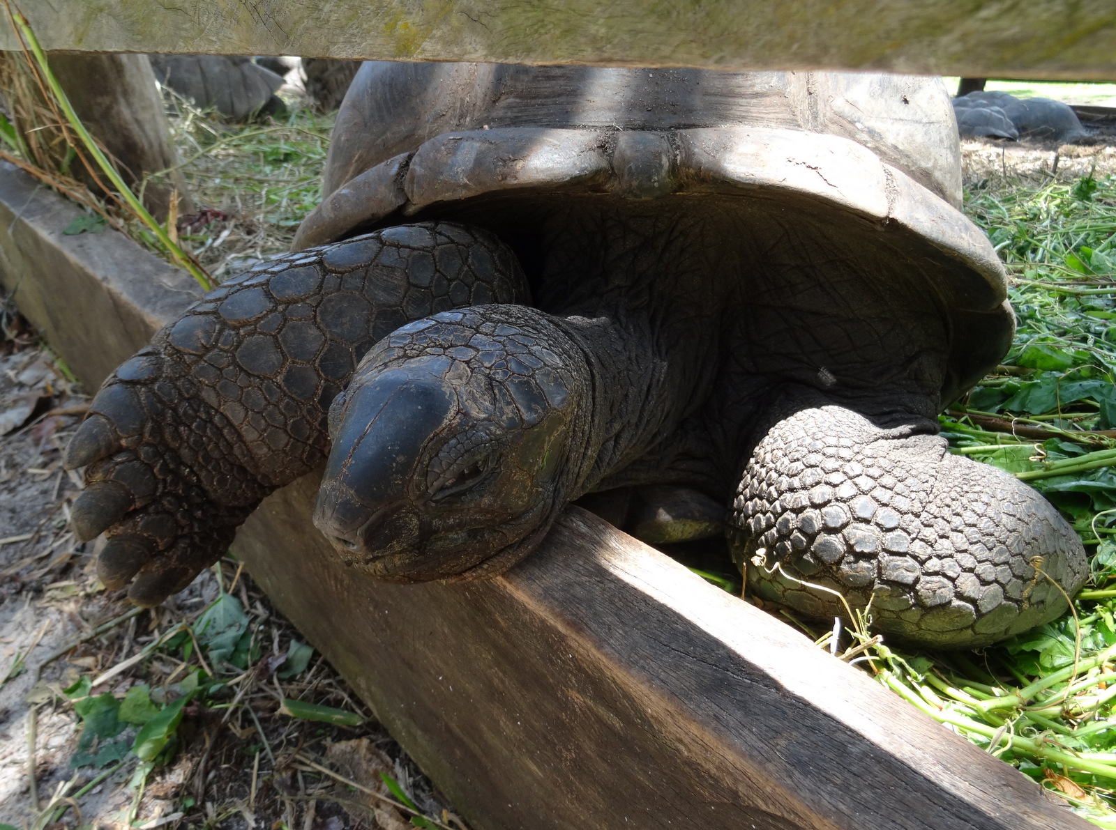 Auch am Anse Lazio gibt es die, in einem Gehege. Schnell aber stelle ich fest, dass die als Transportmittel für zeitlich eingeengte Kreuzfahrer eher nicht geeignet sind und so verlasse ich mich lieber auf den Träger. Da kommen dann wenigstens alle zu spät…