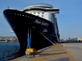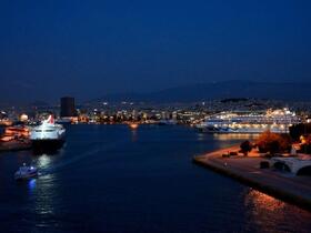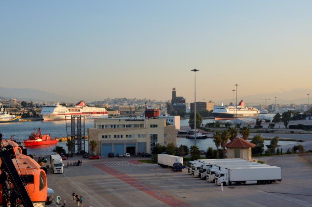 Kapitän Lyddby beherrschte das „Einparken“ perfekt – wir wachten auf, schauten kurz vor 7 Uhr nach draußen und sahen den sich nicht bewegenden Hafenterminal Thermistokles. Ansonsten so gut wie nichts – es war stockdunkel. Eine Fähre legte gerade an; eine Schnellfähre näherte sich hell erleuchtet dem größten Passagierhafen Europas. Das waren die ersten Eindrücke – die nächsten hatten wir beim Frühstück. Draußen wurde es immer heller und wir sahen sehr viele Fähren an den verschiedenen Terminals.