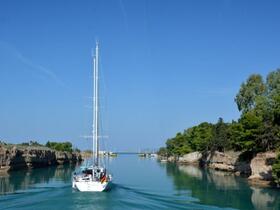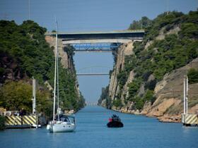 Ein Segelschiff und ein Motorbötchen mussten erst einmal den Kanal verlassen. Sie hatten die Kanallänge von 6.343 m hinter sich gebracht. Dem Foto ist zu entnehmen, dass der Kanal von Korinth schnurgerade zwischen dem griechischen Festland und der Halbinsel Peleponnes verläuft. Alle fünf Brücken sind zu erkennen. In Ordnung, im Moment nur vier Brücken: Autobahn-, Eisenbahn-, Straßenbrücke und die nicht mehr versenkte Brücke am westlichen Kanalausgang.
