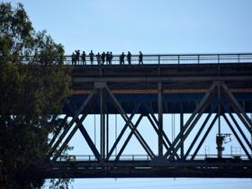 Die „Gaffer“ sollten nach kurzer Zeit Verstärkung erhalten. Uns. Aber zunächst mussten wir runter vom Boot. Dort wurden wir begeistert empfangen. Schon wieder: fauler Hund! Okeh, weil wir nicht beachtet wurden, stürmten wir unverzüglich unseren Bus, der uns zu einem Dokumentationszentrum oberhalb des Kanals und nahe der Landstraßenbrücke brachte. Und raus mit der Meute, die sofort die Brücke erstürmte. Wir hielten uns aus dem Gedränge heraus und schauten uns die Umgebung gemächlich an. Schade, Zulu Bungy stand nicht zur Verfügung und so mussten wir auf einen weiteren Höhepunkt dieses Halbtagesausflugs verzichten (grins …). Zum Ausgleich schauten wir uns eingehend von oben an, was die ungarischen Ingenieure István Türr und Béla Gerster veranlasst hatten.