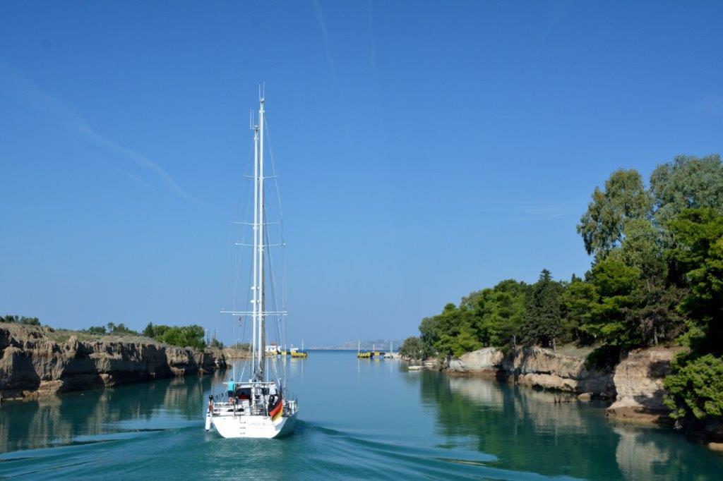 Der Kanalboden weist eine Breite von mindestens 21 m auf; 24,6 m auf dem Niveau des Wasserspiegels. Beim östlichen Kanaleingang steigen die Felsen 79 m in die Höhe; in Richtung des westlichen Ausgangs erreicht die Kanalbegrenzung fast Meeresniveau. So, es war so weit – wir fuhren in den Kanal hinein. Vor uns ein Segelboot aus der Hummel-Hummel-Stadt.
