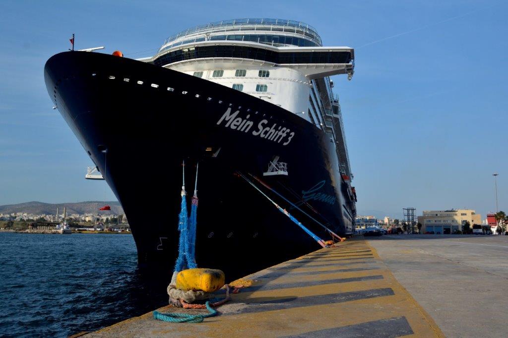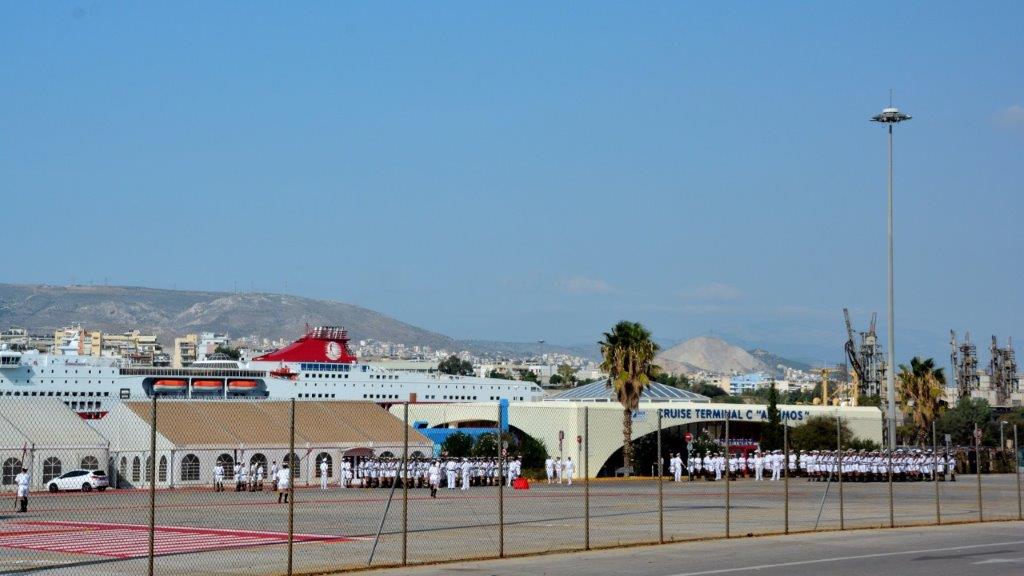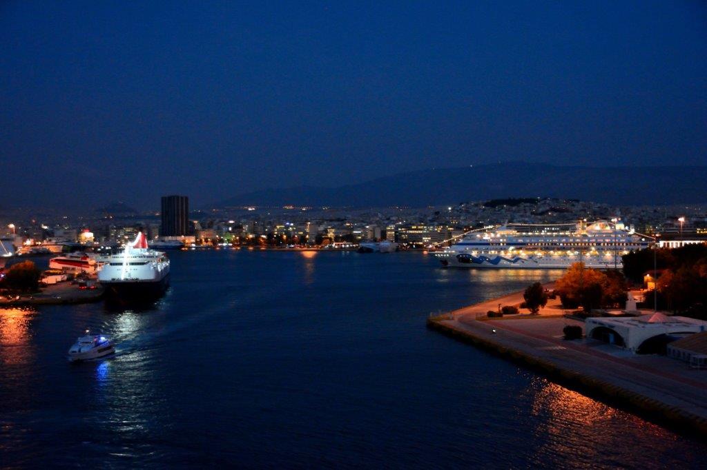 Kapitän Lyddby beherrschte das „Einparken“ perfekt – wir wachten auf, schauten kurz vor 7 Uhr nach draußen und sahen den sich nicht bewegenden Hafenterminal Thermistokles. Ansonsten so gut wie nichts – es war stockdunkel. Eine Fähre legte gerade an; eine Schnellfähre näherte sich hell erleuchtet dem größten Passagierhafen Europas. Das waren die ersten Eindrücke – die nächsten hatten wir beim Frühstück. Draußen wurde es immer heller und wir sahen sehr viele Fähren an den verschiedenen Terminals.