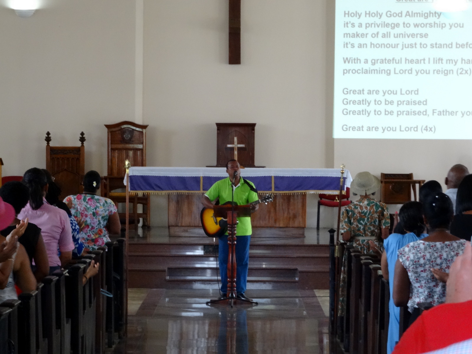 Der Brüller aber ist eine Kirche. Aus der dringt fröhlicher Gesang in Gospel-Manier. Es ist ein Wochentag, gerade Mittagszeit -und die Kirche ist voll. Vorne steht ein Vorsänger mit Gitarre -oder ist es doch ein musikalischer Pfarrer?
