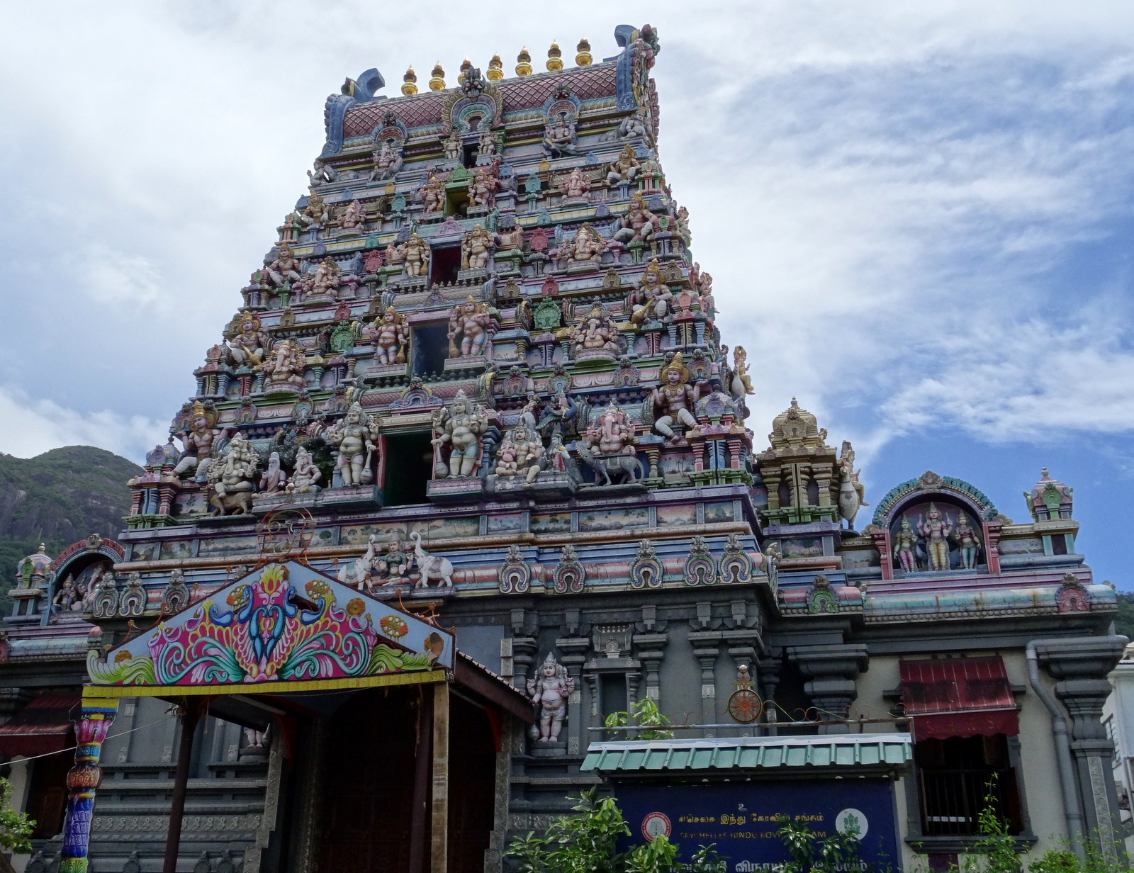 Ab zum Bus. Ein kurzer Abgleich mit meinem Plan zeigt dann aber doch noch eine Besichtigungslücke. Wir haben den Hindutempel vergessen. Also erstmal wieder ein Stück zurück. Ganz in der Nähe vom Markt ist er, aber dennoch sind wir auf der Parallelstr. daran vorbeigelaufen. Leider hat der Tempel um die Mittagszeit geschlossen und öffnet erst wieder um 17:00 Uhr. Er ist hier nicht so offen gestaltet wie auf Mauritius, also bleibt uns im Moment nur die Fassade, also Außenbesichtigung.