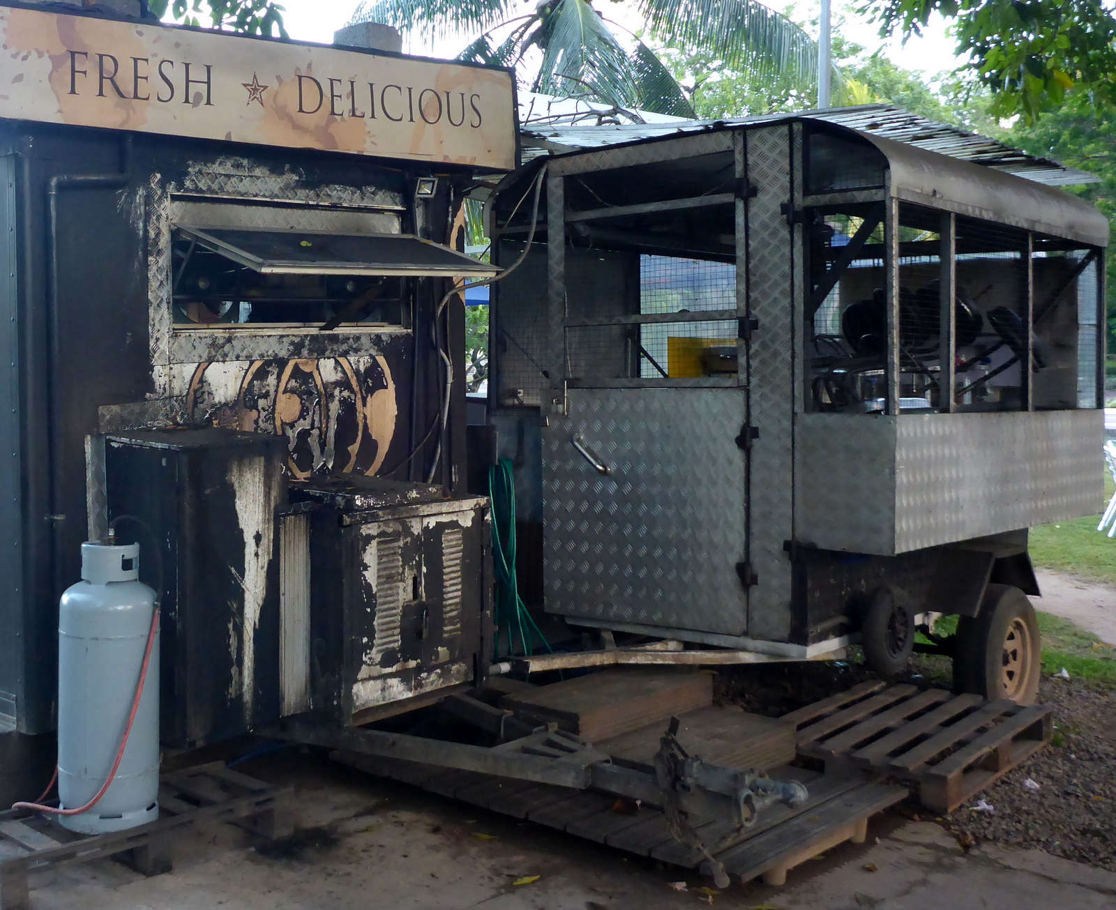 Kurz nach 18:00 Uhr ist es mittlerweile und mit Ausnahme von einigen chinesischen Läden in der Nähe vom Markt und unter anderem diesem Verkaufswagen in der Nähe des Hafen, der sich aber entgegen unserem tendenziellen Geschmack, ausschließlich auf "scharf durchgebraten" spezialisiert hat,