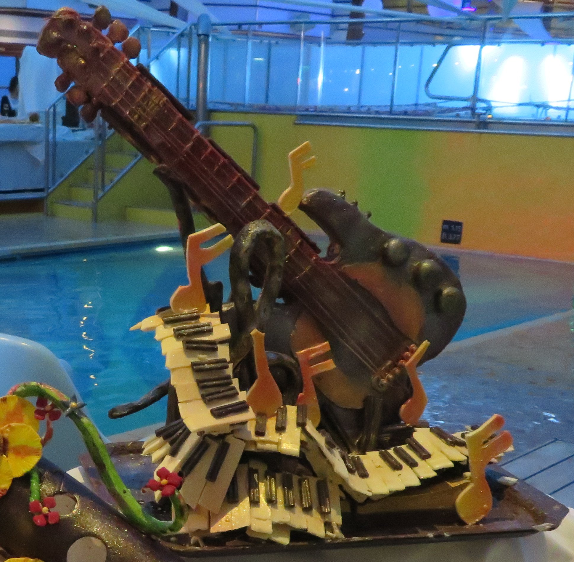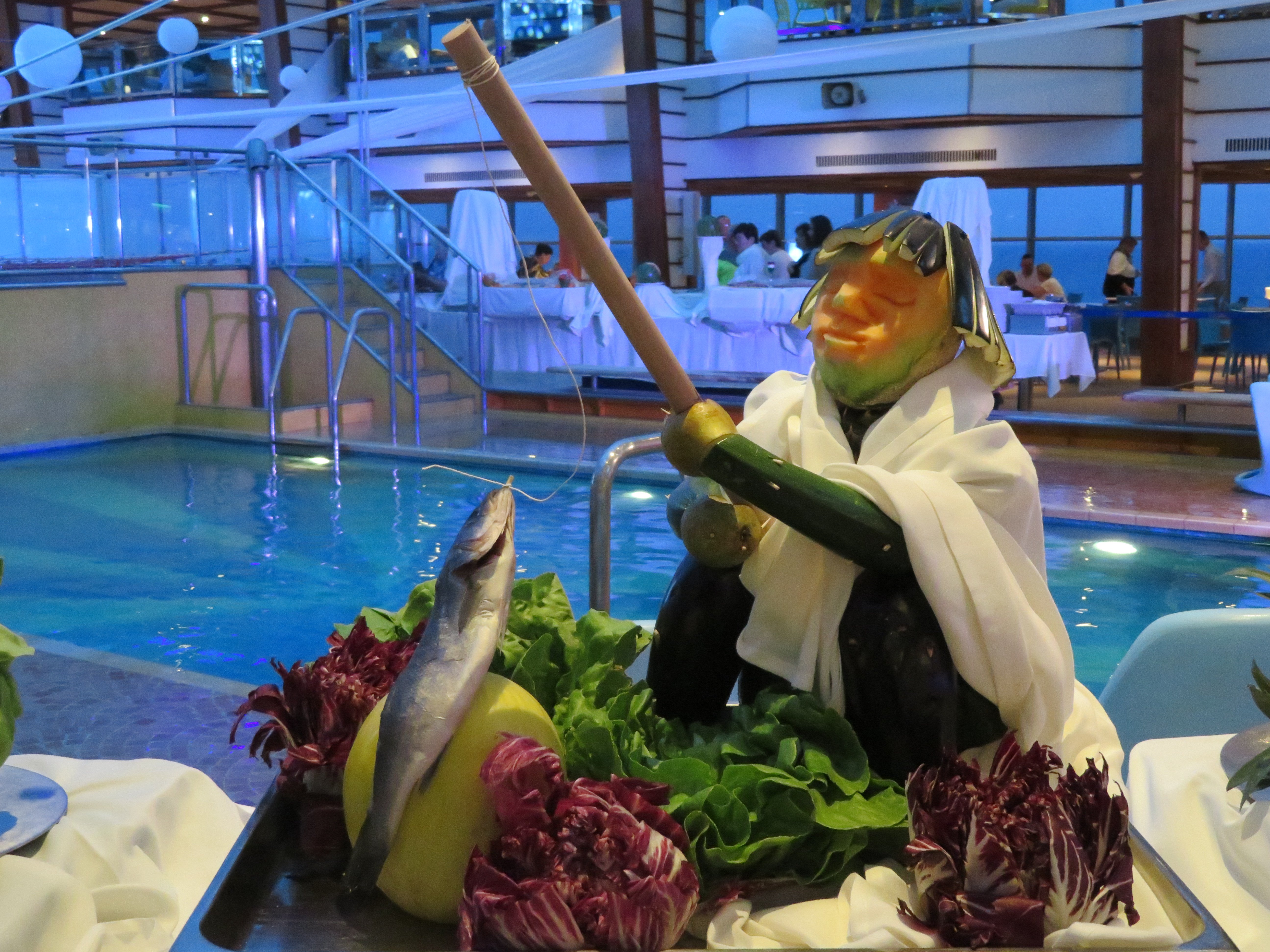 "23.30 Großartiges Buffet: Die spektakulären Kreationen des Chefkochs und seiner Mannschaft" Solche Kreationen kennen wir. Bei Aida wird damit am letzten Abend das Buffet dekoriert und hier sind sie zur Party rund um den Indoorpool arrangiert.