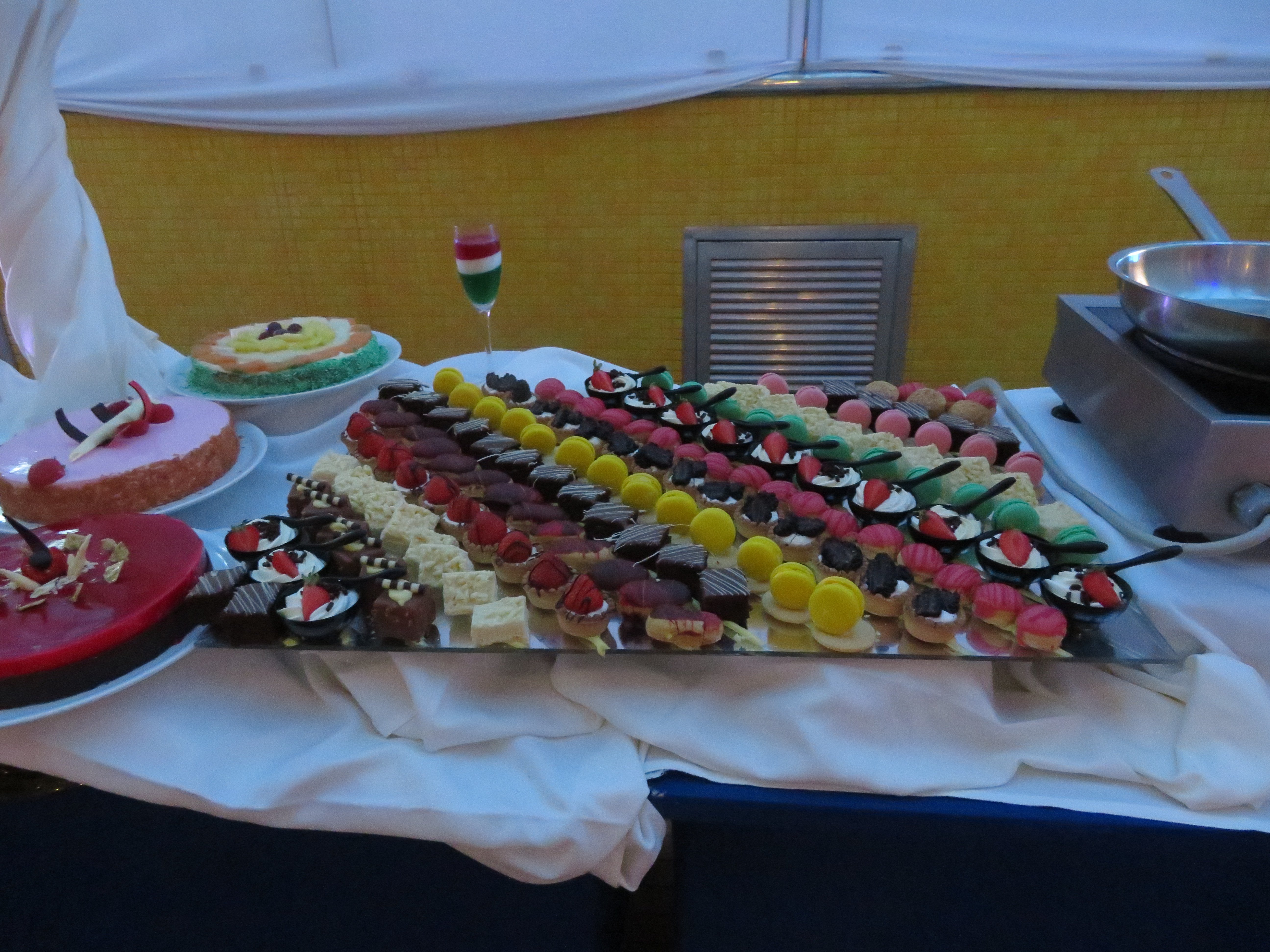 Das Buffet besteht in der Hauptsache aus Obst und jeder Menge Torten und kleinen süßen Teilchen.