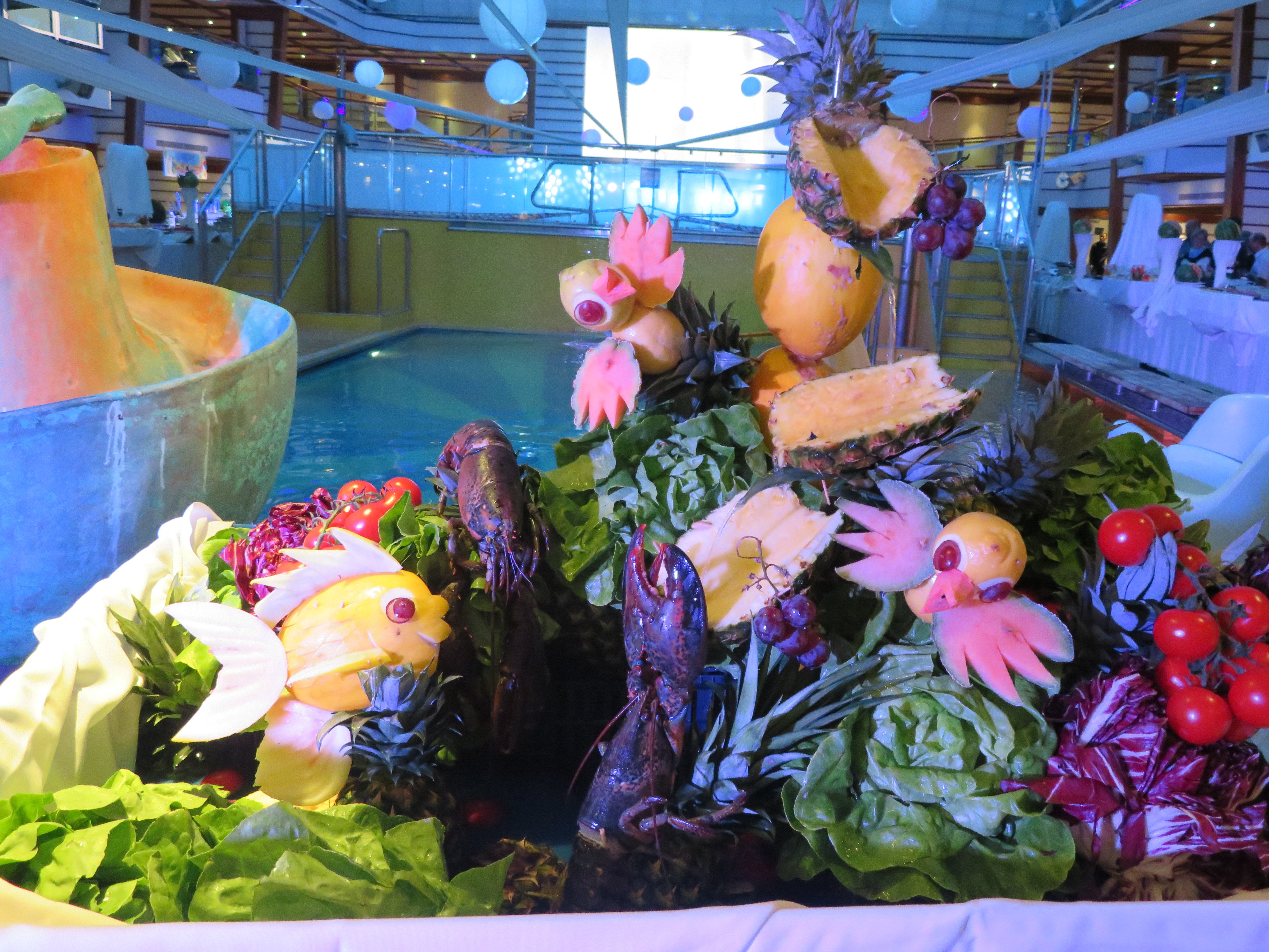 "23.30 Großartiges Buffet: Die spektakulären Kreationen des Chefkochs und seiner Mannschaft" Solche Kreationen kennen wir. Bei Aida wird damit am letzten Abend das Buffet dekoriert und hier sind sie zur Party rund um den Indoorpool arrangiert.