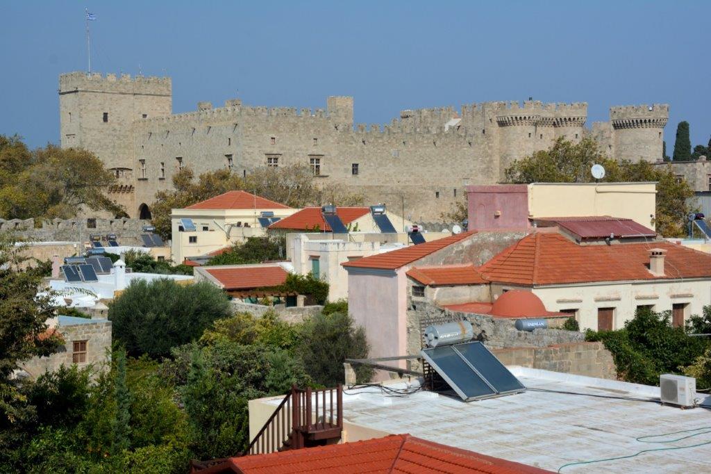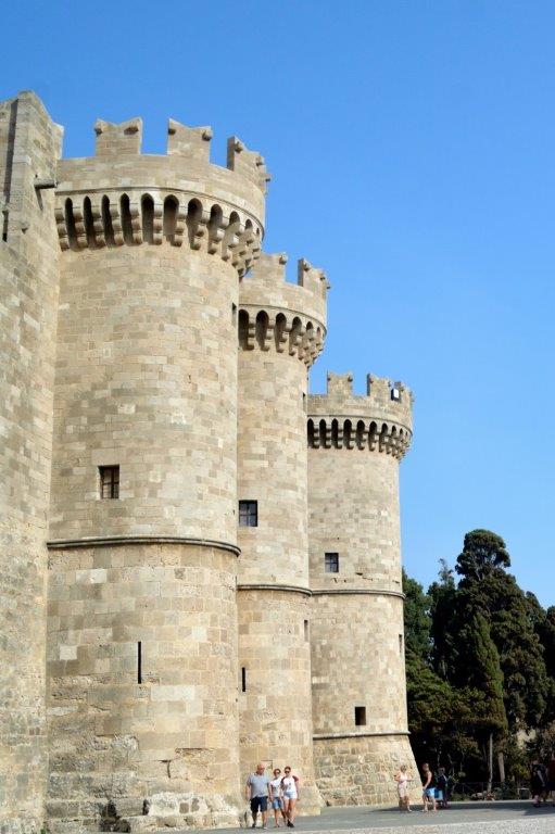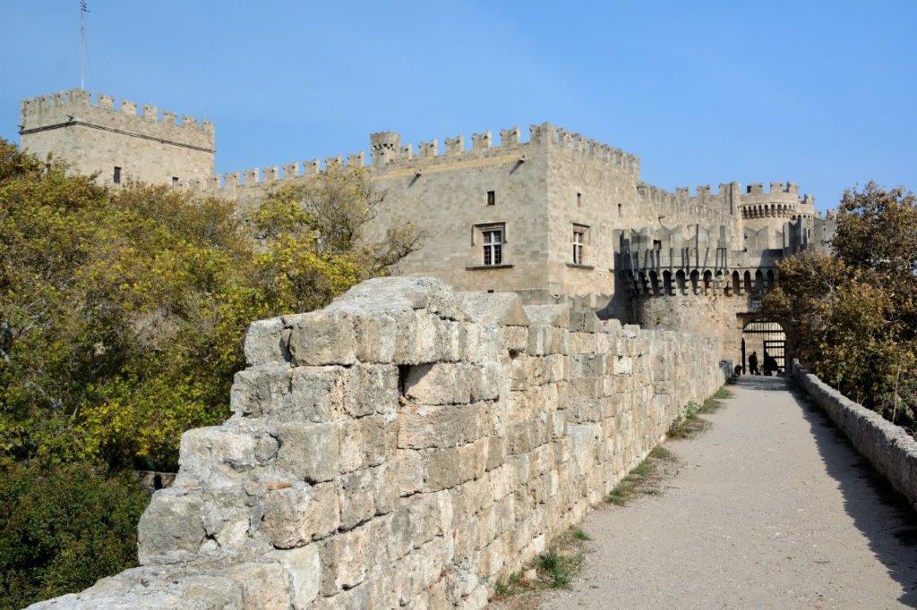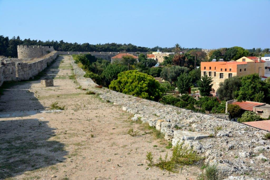 Auf Jahrhunderte alten Steinen und Wehrgängen. Die Byzantiner begannen mit dem Bau der Stadtmauer; nach der Eroberung von Rhodos durch die Johanniter ließ der Orden die zunächst ausreichende Festungsmauer unverändert. Erst als Mitte des 15. Jahrhunderts die Osmanen mehrfach gegen ihr Ärgernis Rhodos vorgingen, erkannten die Johanniter, dass eine Verstärkung des Bollwerks notwendig geworden war. In diesen Jahren wurde die noch heute i.W. unverändert gebliebene Mauer zu dem gemacht, was in der heutigen Zeit Horden von Touristen bewundern. 4 km lang, auf der Landseite durch einen 2,5 km langen Wallgraben verstärkt. Der innere, bis zu 12 m starke Wall erhob sich bis zu 20 m über den bis zu 25 m breiten Wallgraben. Ein für die damaligen Zeiten unüberwindlicher Festungsbau. Bis 1522 mindestens 100.000 – gemunkelt wird über bis zu 200.000 – osmanische Kämpfer 500 Ritter, 1.500 Söldner uns die im Kampf weitgehend unerfahrene Bevölkerung zur Aufgabe zwangen.