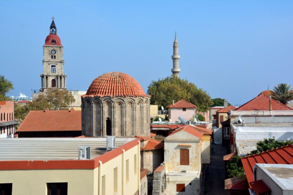 Wo damals viel Leid geschah, spazierten wir unter blauem Himmel. Die den unterschiedlichen Landsmannschaften der Ritter zugeordneten Mauerabschnitte lagen zwischen mächtigen Bastionen bzw. mit Türmen versehen Toren. Unglaublich, was vor Jahrhunderten ohne die heute üblichen Hilfsmittel geschaffen wurde. Wir bewunderten es bei 27°, vergaßen aber nicht, auch einzelne Abschnitte der Altstadt auf uns einwirken zu lassen. Wie den Stadtteil Kollachium mit Uhrturm, Kuppel der Church of Agios Georgios in the Fortifications und Minarett der Süleyman-Pascha-Moschee.
