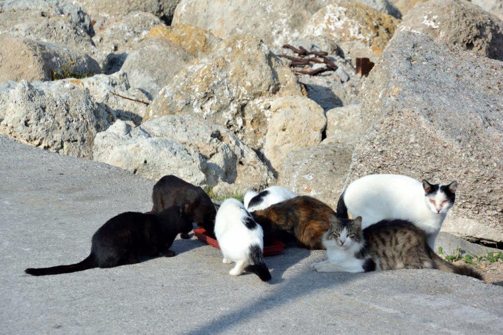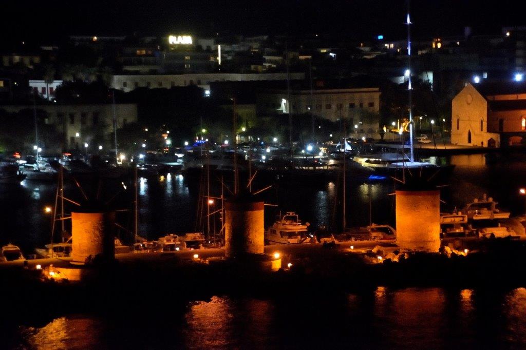Sie mussten keine Angst haben zu verhungern. Auf Rhodos gab es anscheinend zahlreiche Katzenfreunde, die die wild lebenden Katzen fütterten. Der nächste Hingucker waren die drei Windmühlen (s.a. Introfoto). Sie standen in ihrer Urform schon seit Jahrhunderten auf dem Wellenbrecher. Anlandende Schiffe luden dort ihre Getreidefracht aus, die sofort gemahlen wurde.
