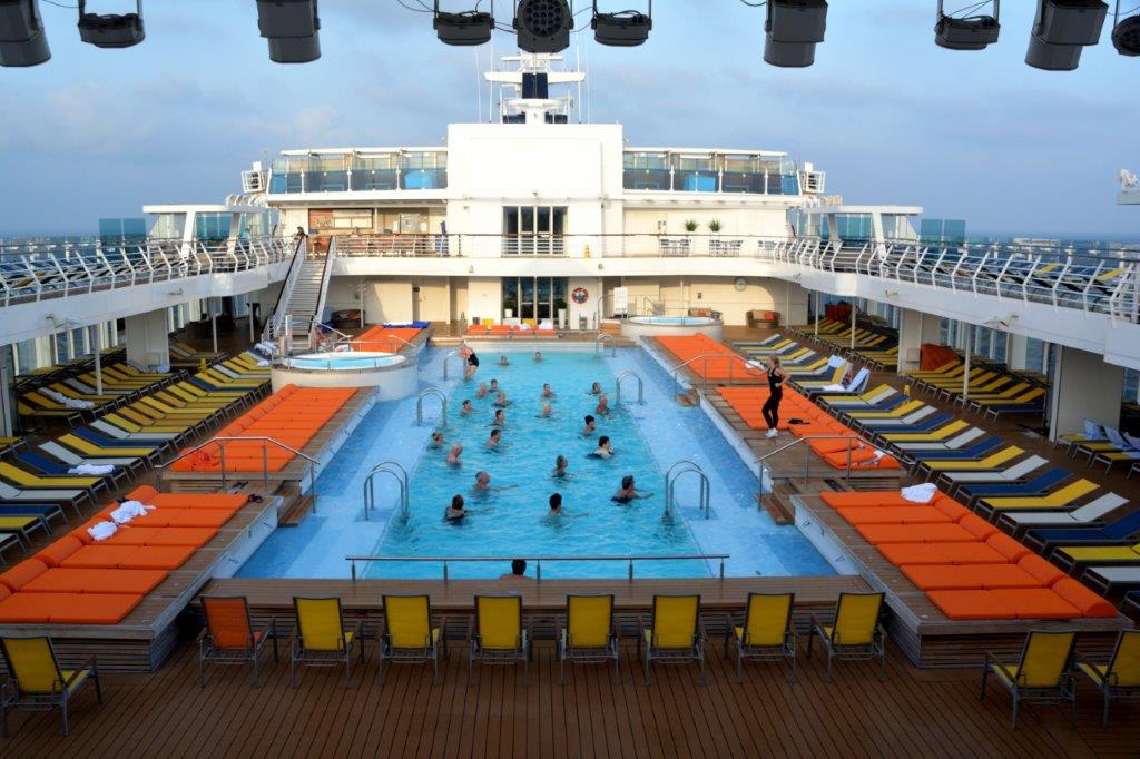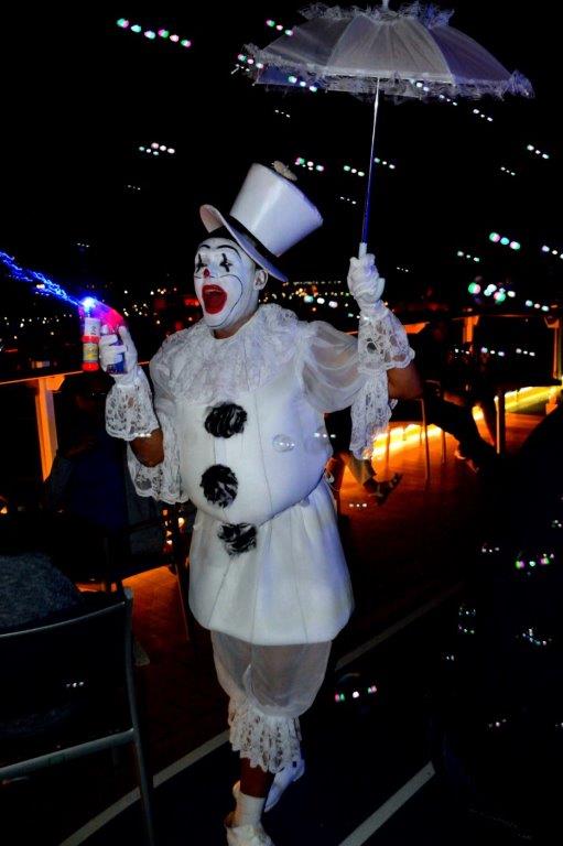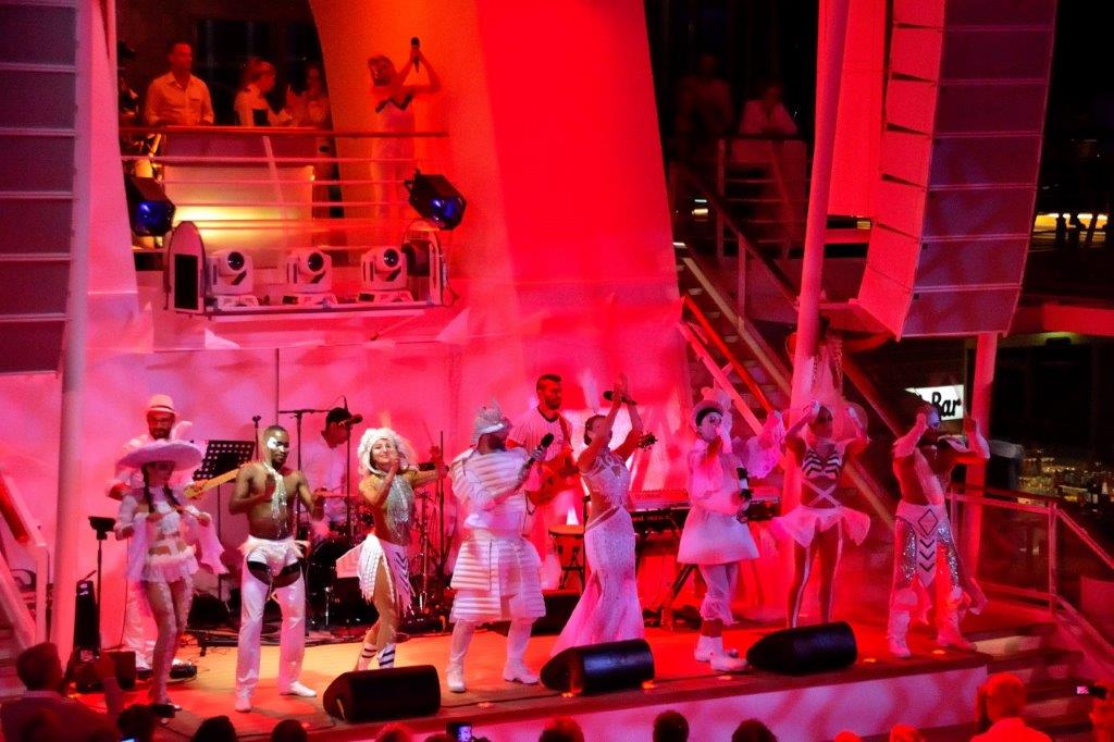 Nach dem Abendessen versuchten wir, auf Deck 14 einen freien (Steh-)Platz mit Blick auf das Pooldeck zu ergattern. Schwierig, schwierig – die White Party stand an. Bereits lange vor dem offiziellen Beginn war alles gerammelt voll. Es war mehr los als bei entsprechenden AIDA-Partys. Wohlgemerkt, bei lauschigen Temperaturen. In phantasievollen weißen Kostümen gekleidet