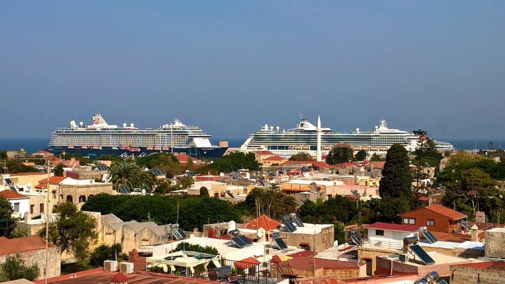 Wie der Blick über die Dächer auf die beiden Kreuzfahrtschiffe.