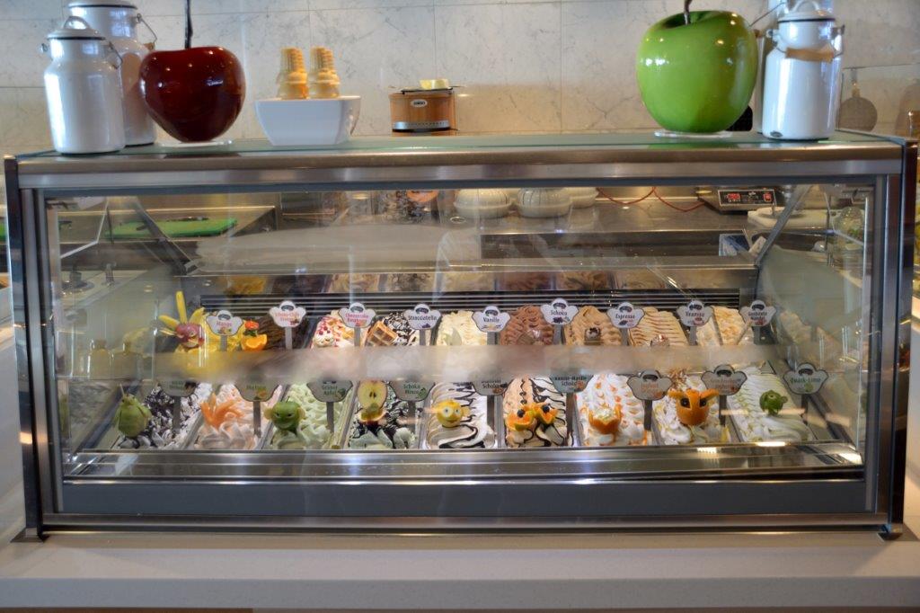 Und schon betraten wir Unser Schiff. Gut, dass es noch nicht zu spät für Kaffee und Kuchen war. Nicht direkt Kuchen sondern Kirschstrudel und Ananasstreusel mit Vanillesoße. Diese und ähnliche Variationen gab es täglich. Nach einem Cappuccino in der Außenalster erinnerte ich mich daran, dass ich an diesem Tag die Eisstation links liegen gelassen hatte. Also nix wie hin … 18 Sorten gab es zur Auswahl!
