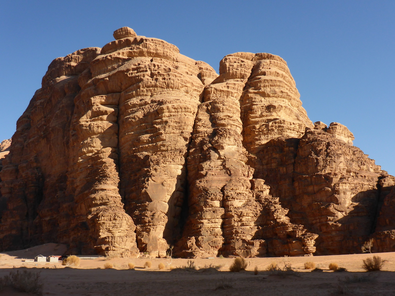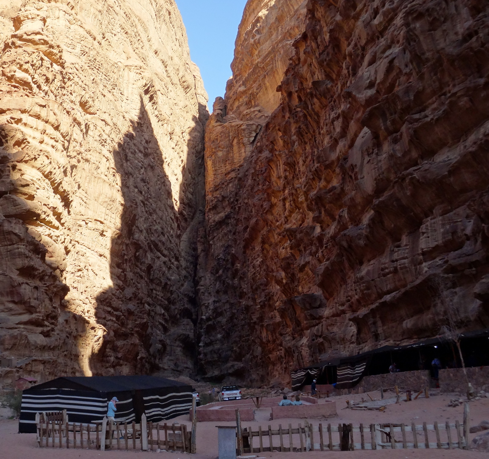 Teddy fasst mal zusammen: Der Ausflug war toll. Grandiose Fels- und Wüstenlandschaft. Tolles Licht. Man sollte aber keine Einsamkeit und kein Beduinenzelt erwarten, in welchem man sich mit verschränkten Beinen im kleinen Kreis in bestickte Kissen lümmelt. Das ist bei etwa 300 Halbtags-Wüstensöhnen auch kaum möglich. Es ist ein Festzelt mit Bestuhlung in der Art von Biertischen und die angepriesene Folklore-Darbietung besteht aus 4 oder 5, in Sirtaki-Art tanzenden Männern. Und der Ausflug heißt ja „Wadi Rum zum Sonnenuntergang“. Wir sind durchgefahren, haben angehalten und Sonnenuntergang war auch gewesen –halt nur nicht für uns. Für uns war also eher der Weg das Ziel. Also (fast) alles gut.