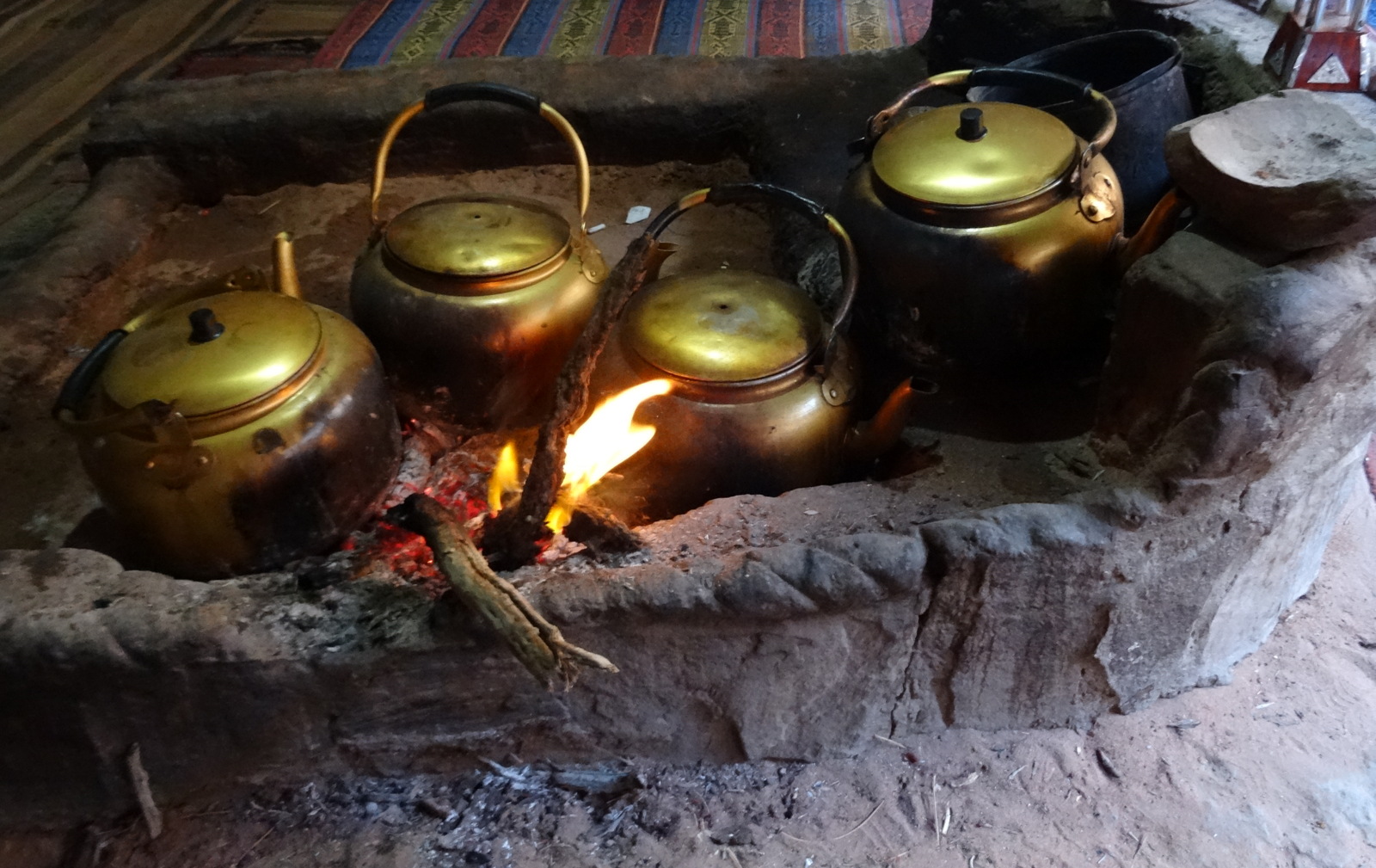 in einem Zelt einen Tee vom offenen Feuer.