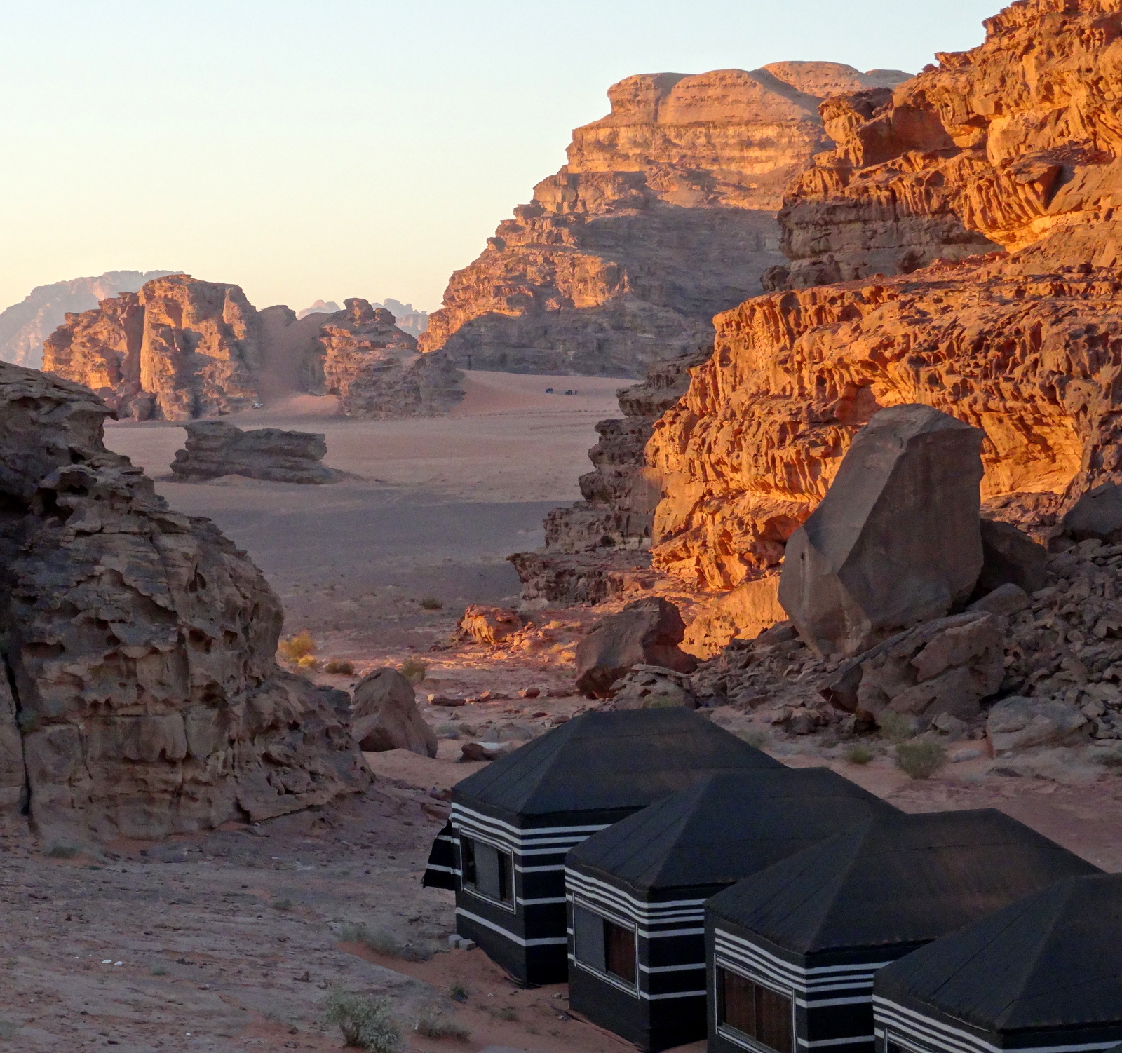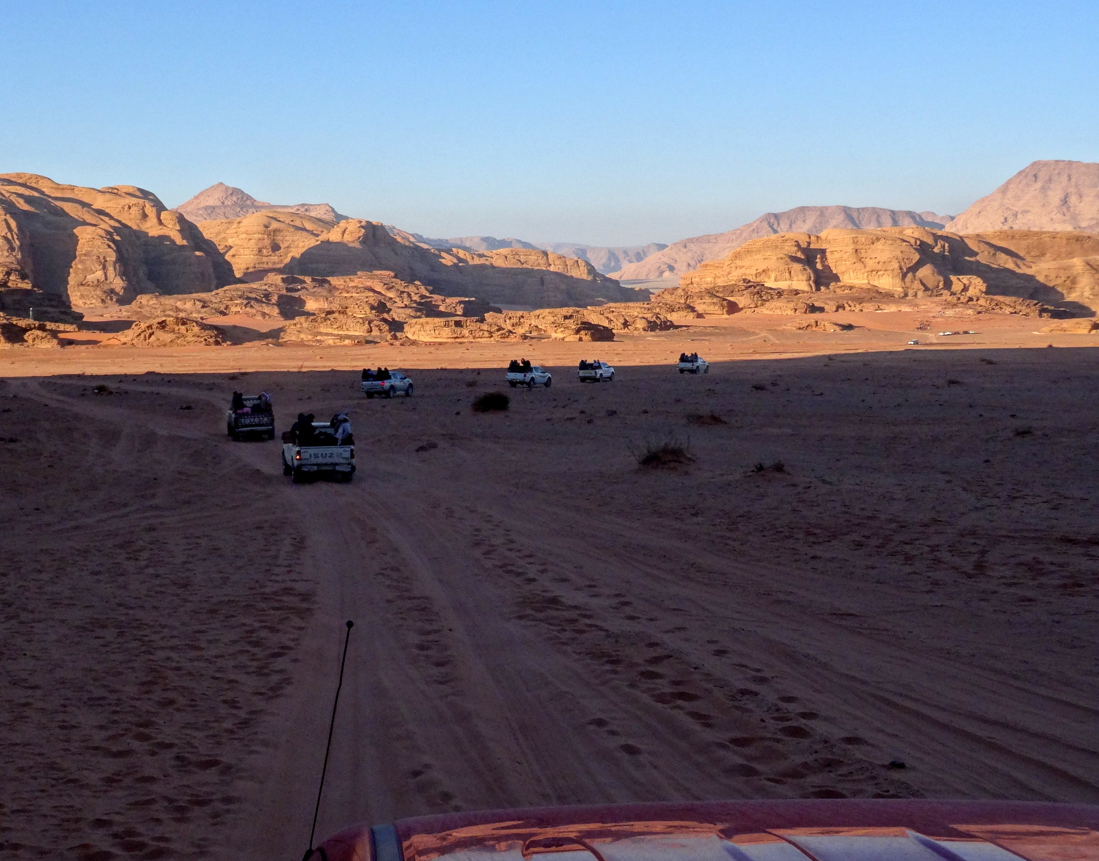 Teddy fasst mal zusammen: Der Ausflug war toll. Grandiose Fels- und Wüstenlandschaft. Tolles Licht. Man sollte aber keine Einsamkeit und kein Beduinenzelt erwarten, in welchem man sich mit verschränkten Beinen im kleinen Kreis in bestickte Kissen lümmelt. Das ist bei etwa 300 Halbtags-Wüstensöhnen auch kaum möglich. Es ist ein Festzelt mit Bestuhlung in der Art von Biertischen und die angepriesene Folklore-Darbietung besteht aus 4 oder 5, in Sirtaki-Art tanzenden Männern. Und der Ausflug heißt ja „Wadi Rum zum Sonnenuntergang“. Wir sind durchgefahren, haben angehalten und Sonnenuntergang war auch gewesen –halt nur nicht für uns. Für uns war also eher der Weg das Ziel. Also (fast) alles gut.