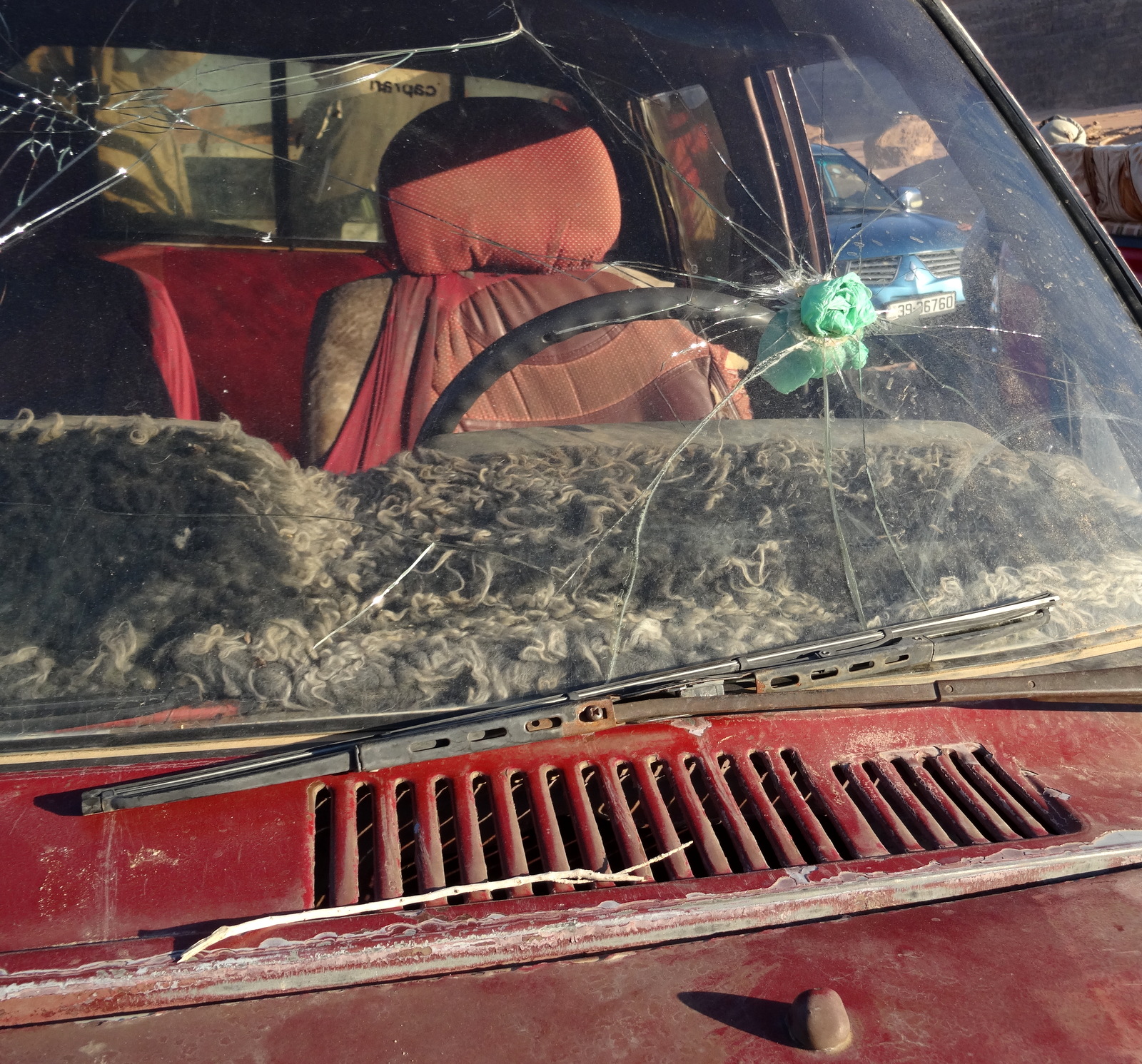 Wir sitzen aber eh woanders. Auf jede Ladefläche passen auf die Bänke 6 Personen. Die Teddys landen im Fußraum. Durch den Staub geht die Fahrt los. Und wir scheinen Glück zu haben, dass wir zufällig das Fahrzeug des Kolonnenführers erwischt haben. Sollte sich später aber noch rächen…