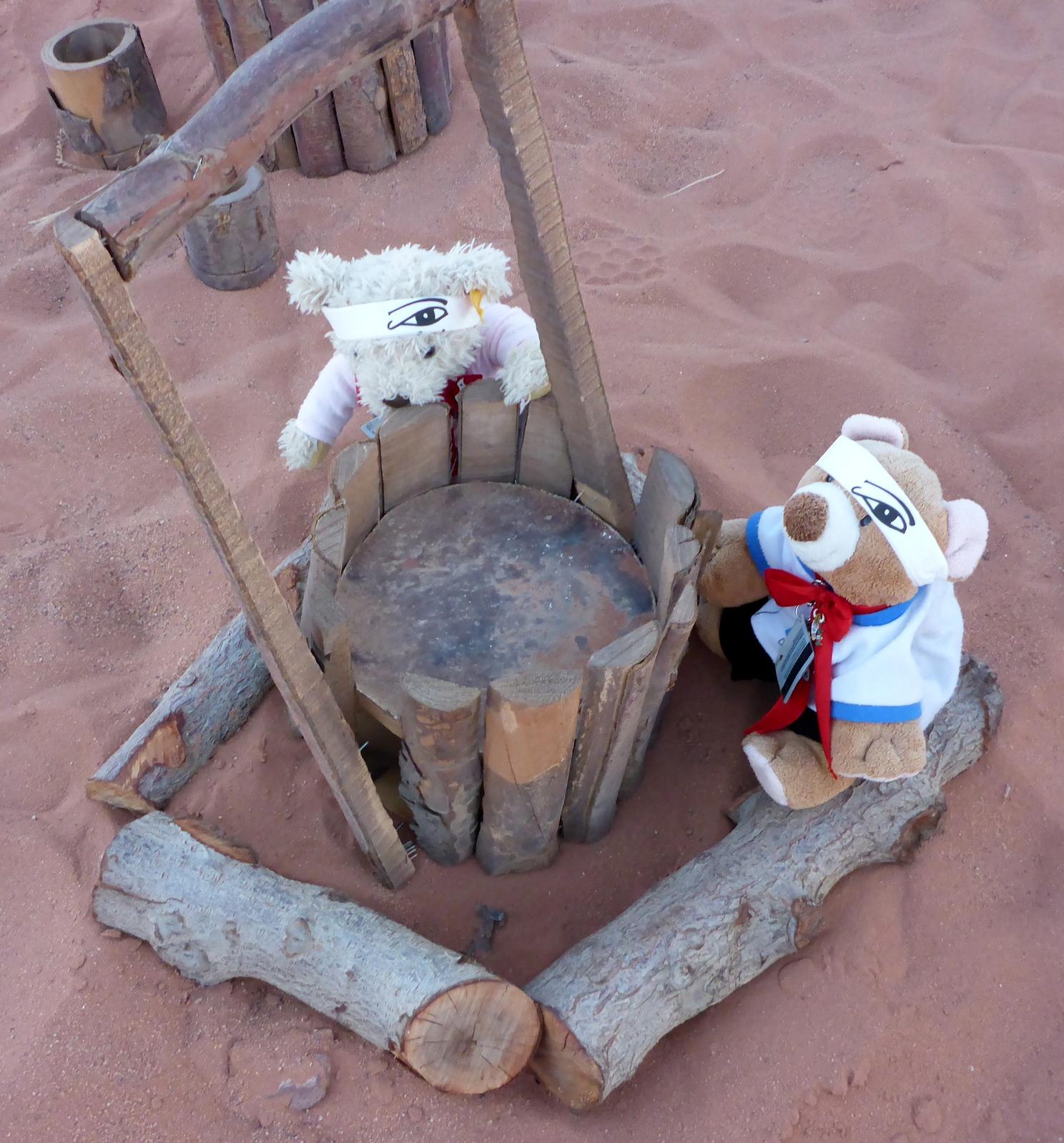 Ty jammert und bringt sein traumatisches Erlebnis mit der Waschmaschine ins Spiel –von vor einem Jahr, als er nach 7 Jahren in der Kiste vom Speicher befreit wurde und eine intensive Reinigung des ganzen Ty unabdingbar war. Die Aussicht auf dieses Schicksal, lässt den Teddy umgehend handeln. Schei…was auf die Aussicht! Tief in den Rucksack und erstmal den Reißverschluss zu… Die Wüste ist ja schon menschenfeindlich, aber vor allem feindlich für jemanden, der dann nicht nur seine Klamotten, sondern auch sich selbst in die Waschmaschine stecken muss. Für Plüschteddys also eher ungeeignet…