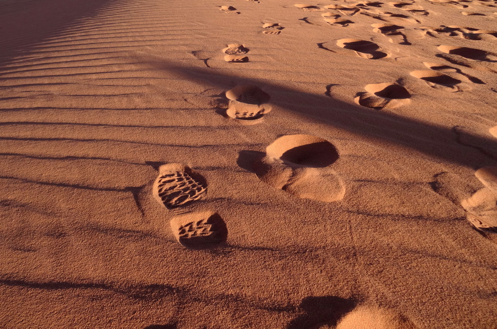 Diesen Platz gilt es nun zu erreichen. Ein Wettlauf gegen die Zeit, ein Wettlauf gegen die Sonne. Und gegen die kann man nicht gewinnen. Absitzen, durch den tiefen Sand schweren Schrittes den Berg hochstapfen, dabei schon die Kamera zücken und dann, schweren Atems fast am Ziel, kommen uns die anderen schon alle entgegen und ein anderer Guide schüttelt unverständig den Kopf und gibt uns auf unseren letzten Metern noch die salbungsreichen Worte mit: „Was wollt ihr denn jetzt noch hier?“ Und was soll ich sagen-er hat Recht. Die Sonne ist untergegangen, -das Schauspiel zu Ende. Glutrot und atemberaubend toll, so hatte es der Guide angepriesen. Nun gut, dafür ist es nicht mehr so voll hier oben, -wir sind fast allein. Und der Teddy weiß dann aber auch nicht, was er jetzt noch hier oben soll. Was sollte diese Aktion!?!