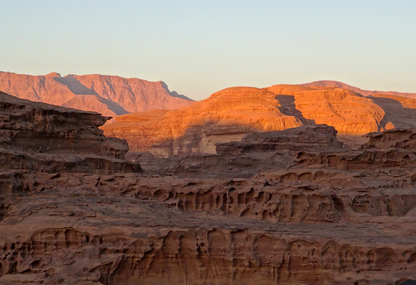 Teddy fasst mal zusammen: Der Ausflug war toll. Grandiose Fels- und Wüstenlandschaft. Tolles Licht. Man sollte aber keine Einsamkeit und kein Beduinenzelt erwarten, in welchem man sich mit verschränkten Beinen im kleinen Kreis in bestickte Kissen lümmelt. Das ist bei etwa 300 Halbtags-Wüstensöhnen auch kaum möglich. Es ist ein Festzelt mit Bestuhlung in der Art von Biertischen und die angepriesene Folklore-Darbietung besteht aus 4 oder 5, in Sirtaki-Art tanzenden Männern. Und der Ausflug heißt ja „Wadi Rum zum Sonnenuntergang“. Wir sind durchgefahren, haben angehalten und Sonnenuntergang war auch gewesen –halt nur nicht für uns. Für uns war also eher der Weg das Ziel. Also (fast) alles gut.
