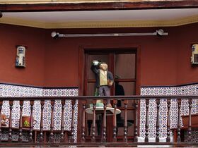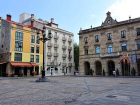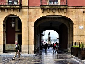 An der „Plaza Mayor“ liegt das historisches Rathaus „Ayuntamiento de Gijón“. Auf einem Balkon entdecken wir eine Szene, die die Zeremonie des Einschenkens von Sidra nachstellt. Durch einen Torbogen sehen wir die Statue „Estatua de Pelayo“. Bevor wir die „Plaza Mayor“ verlassen, mache ich noch eine Panoramaaufnahme.