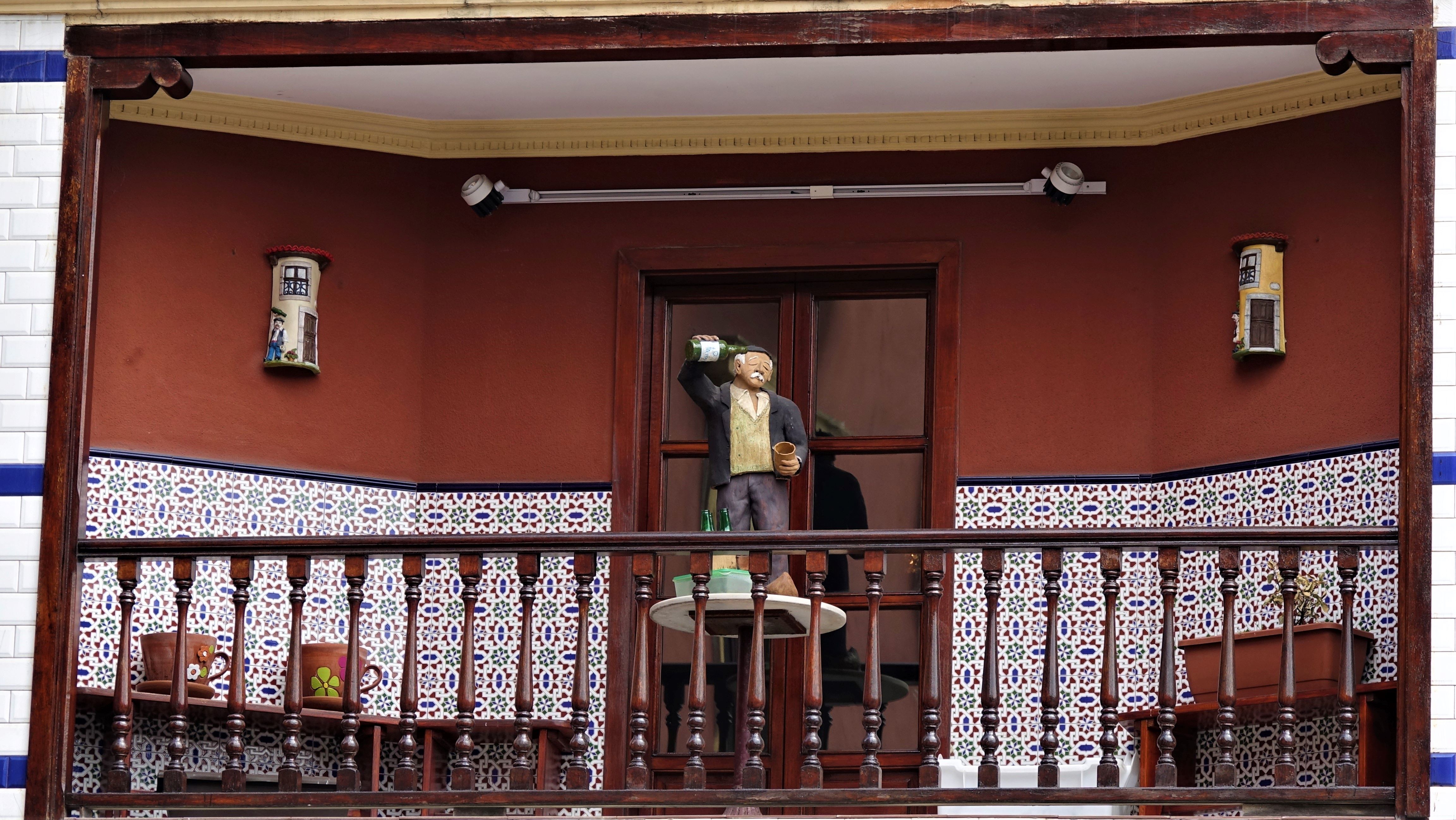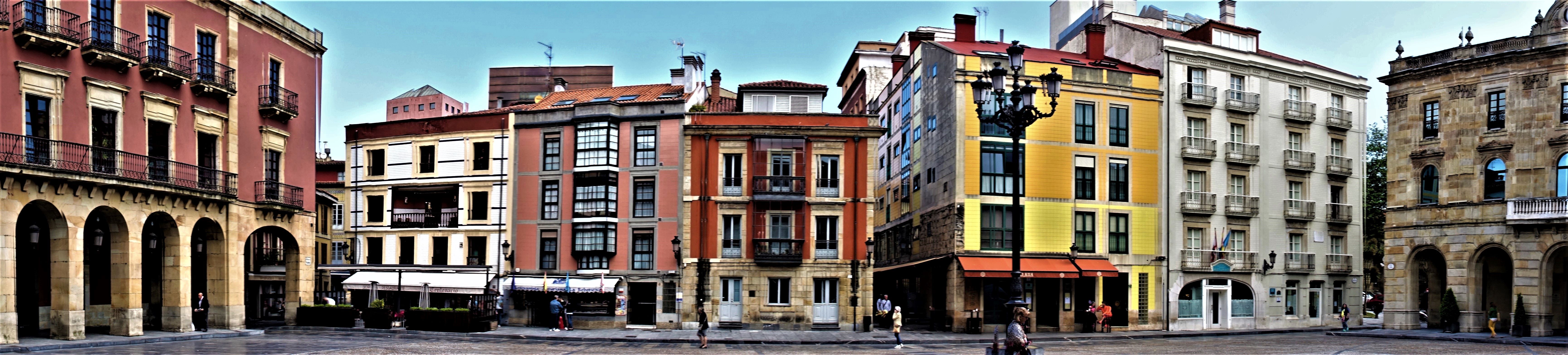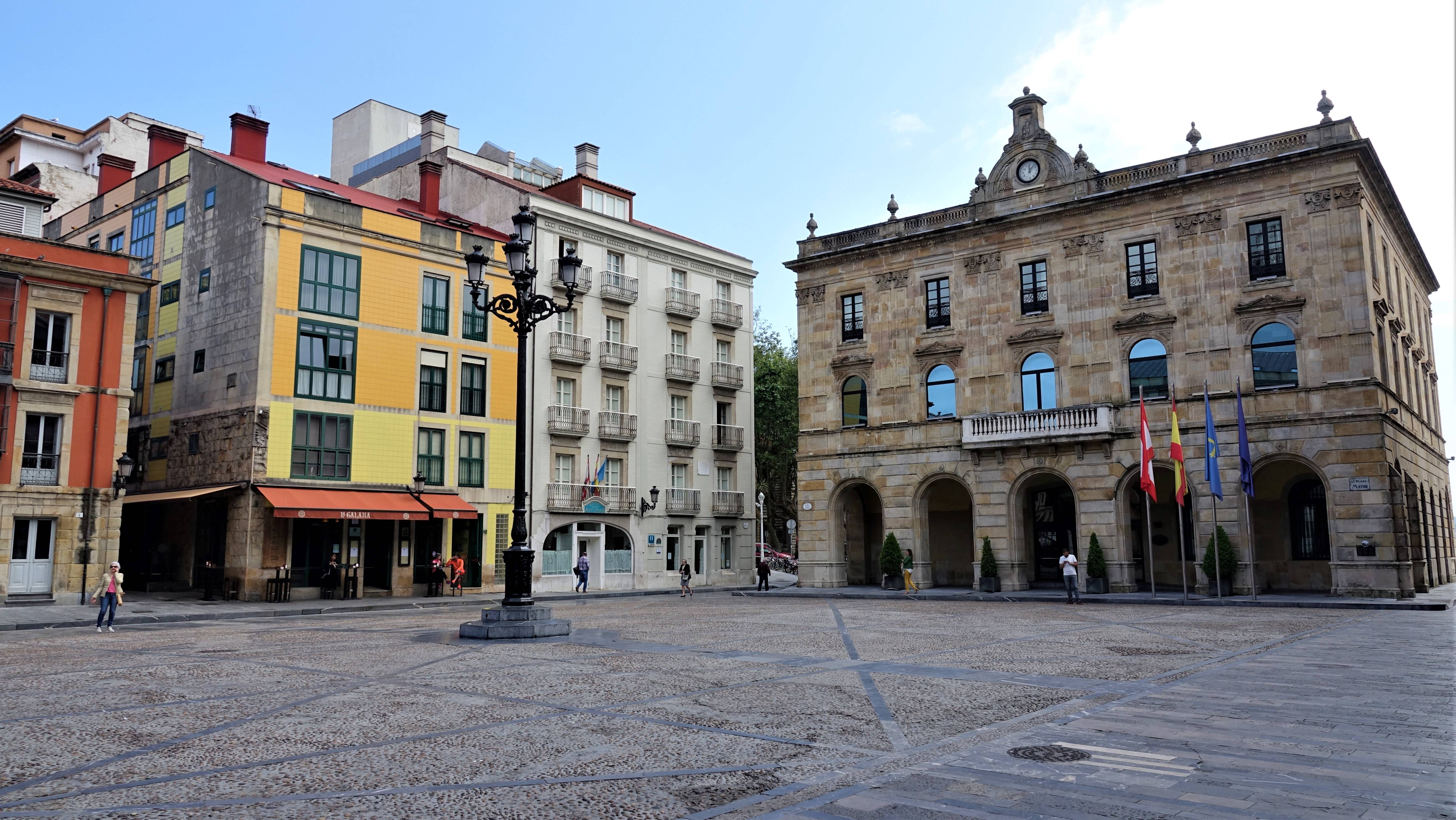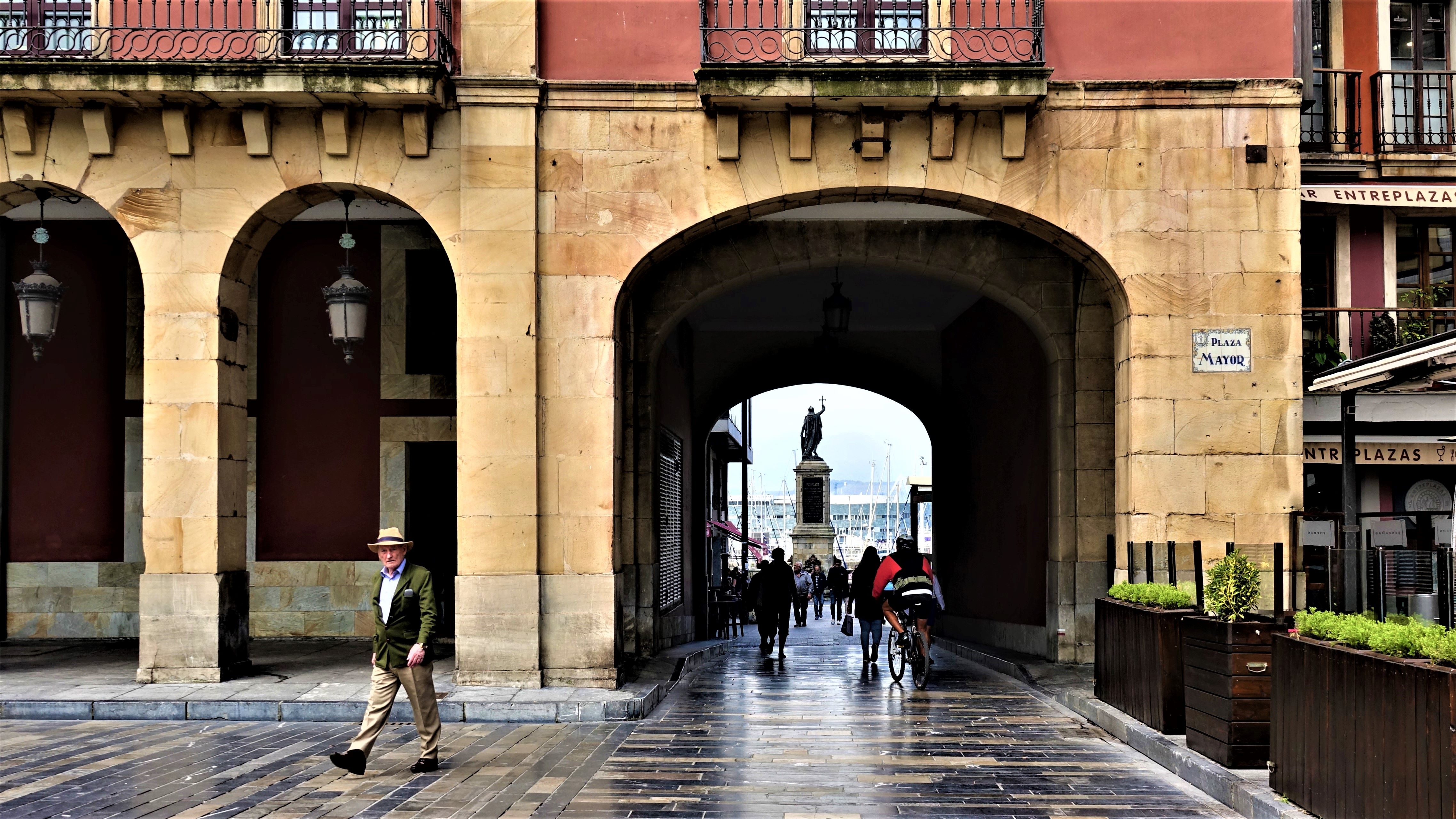 An der „Plaza Mayor“ liegt das historisches Rathaus „Ayuntamiento de Gijón“. Auf einem Balkon entdecken wir eine Szene, die die Zeremonie des Einschenkens von Sidra nachstellt. Durch einen Torbogen sehen wir die Statue „Estatua de Pelayo“. Bevor wir die „Plaza Mayor“ verlassen, mache ich noch eine Panoramaaufnahme.