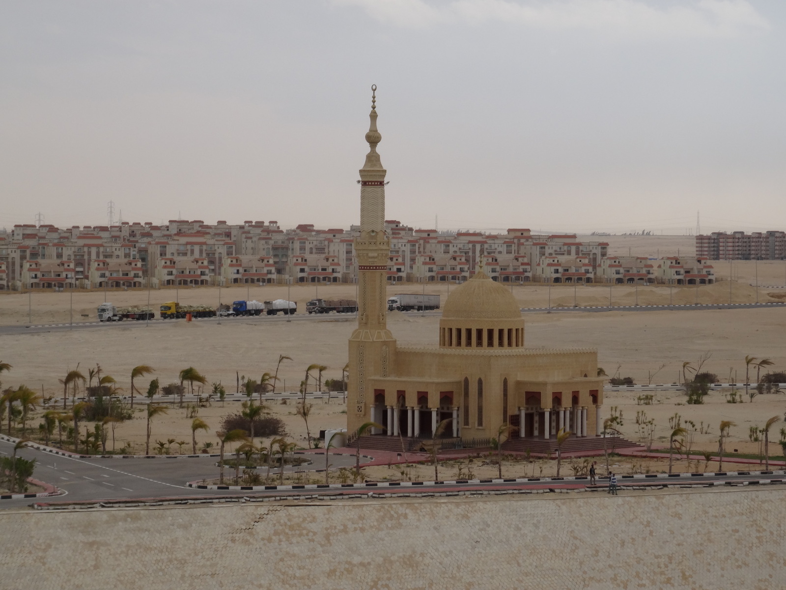Trabantenstadt. Alle Häuser sehen gleich aus und alle stehen mitten im Sand.