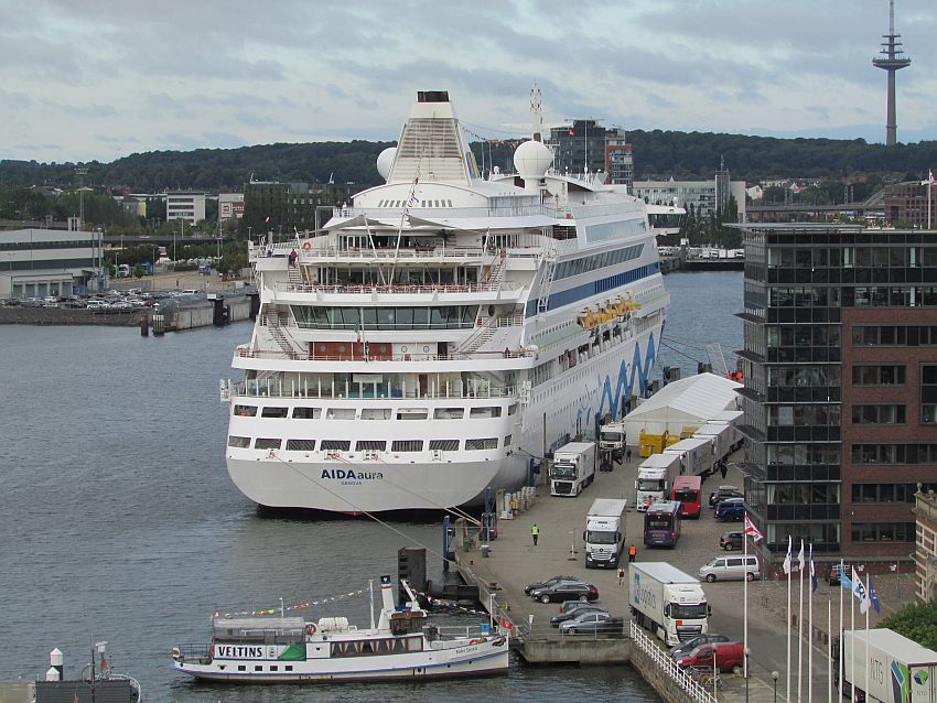 Die kleine AIDAaura hat inzwischen am Sartorikai festgemacht, direkt neben dem Kieler Schifffahrtsmuseum.