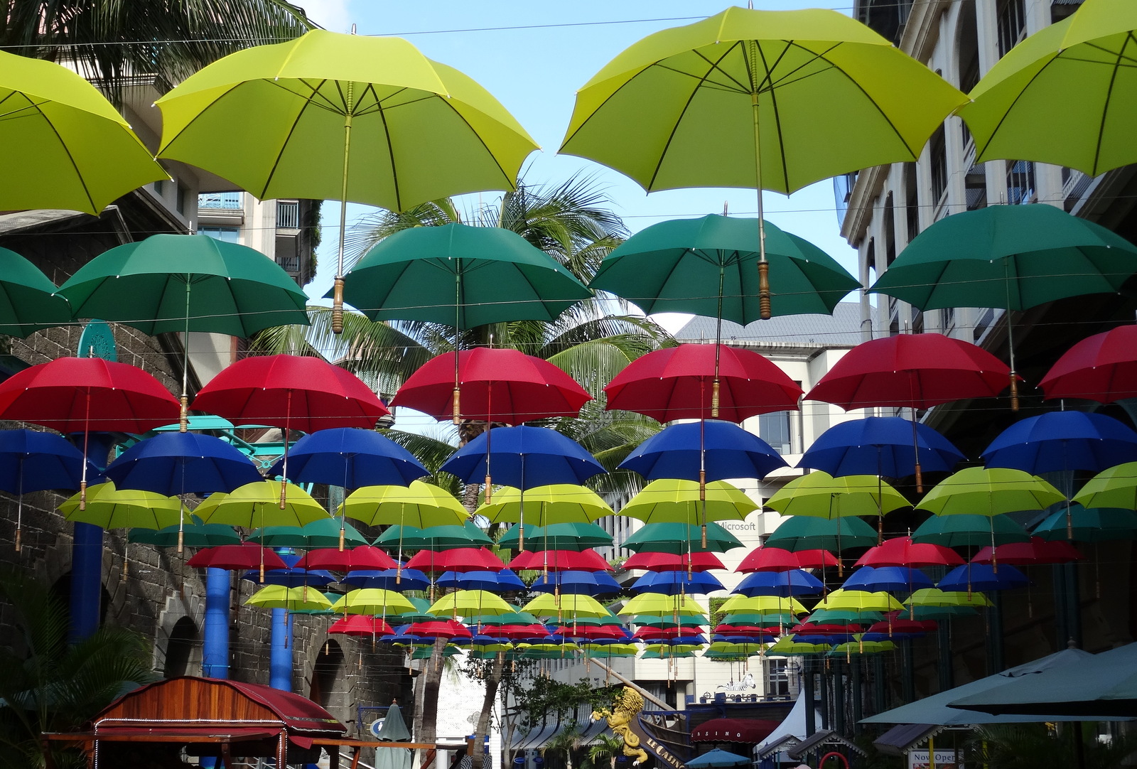 Selbst diese Konstruktion, in Port Louis/Mauritius, an der dortigen Waterfront noch mit den aufgespannten Regenschirmen,