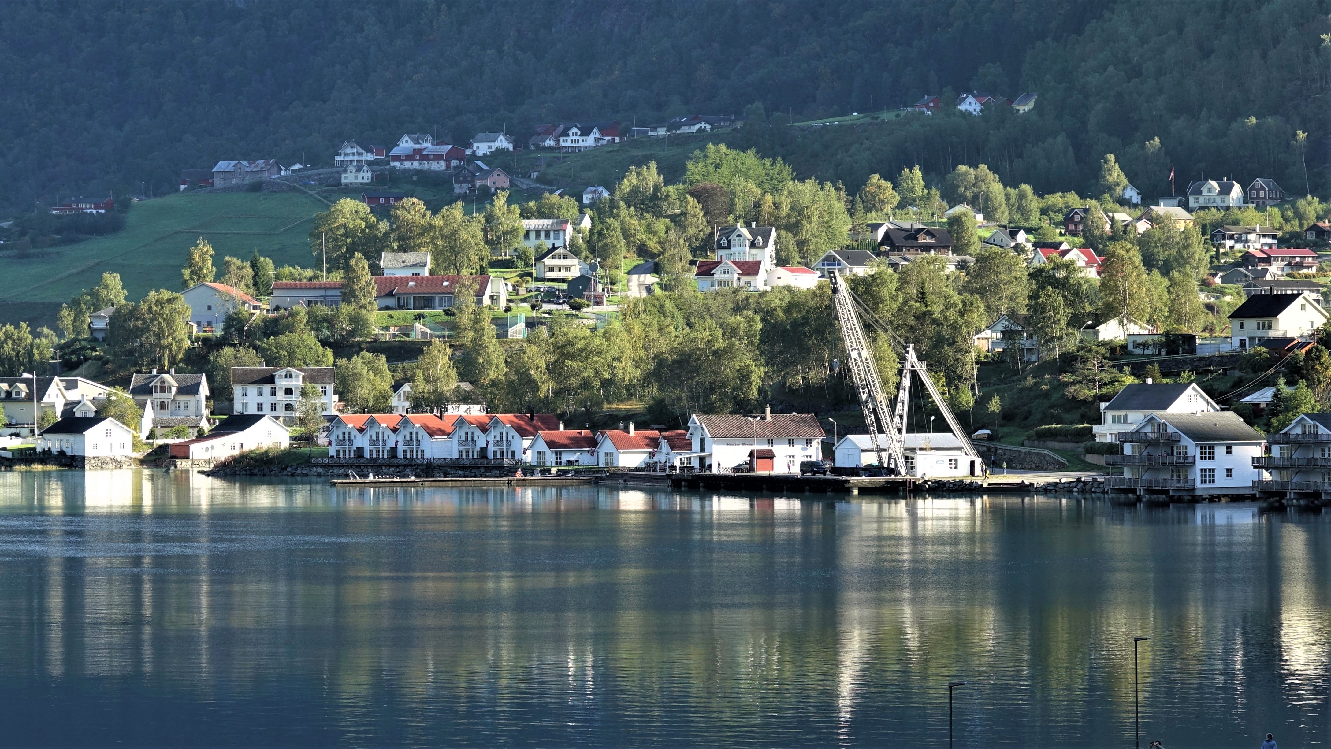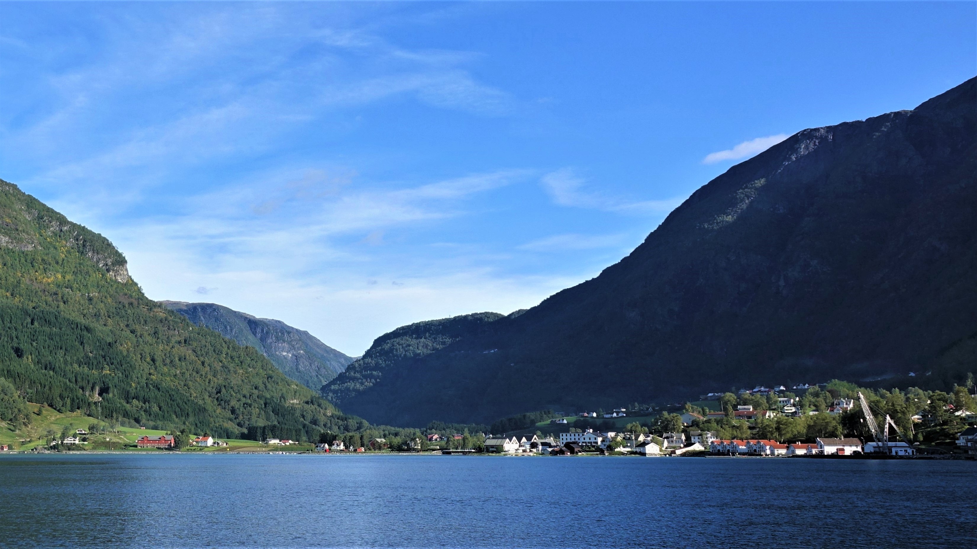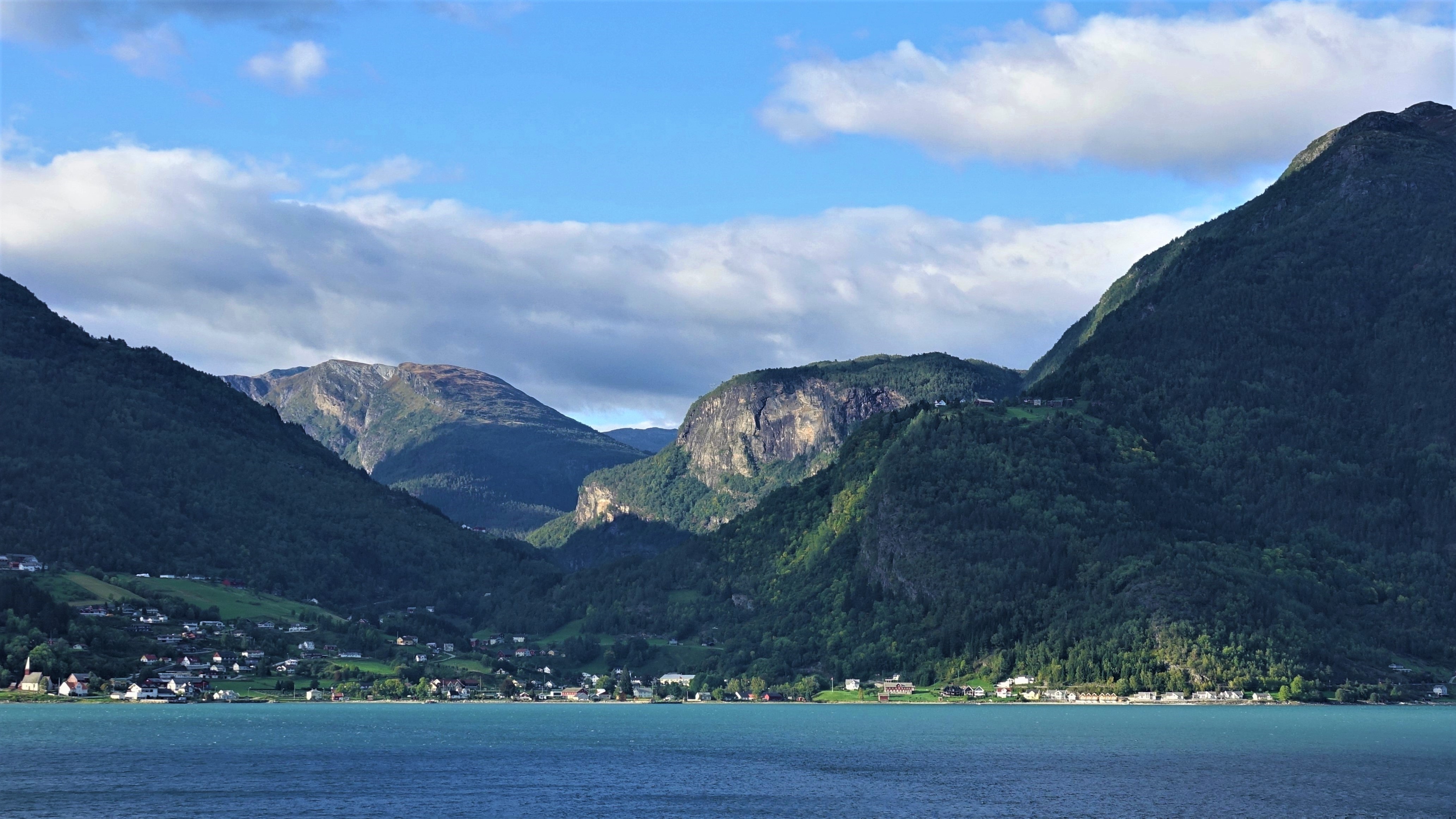 Als wir morgens an der etwas abseits liegenden Pier von Skjolden festgemacht haben, ist es wettertechnisch noch ziemlich zugezogen, so dass die ersten Fotos, die ich vom Balkon gemacht habe, das spätere Sortieren nicht überleben werden. Wenig später, nach dem Frühstück und kurz vor Verlassen des Schiffes, bietet sich uns vom Balkon dann dieser Blick auf den Ort.