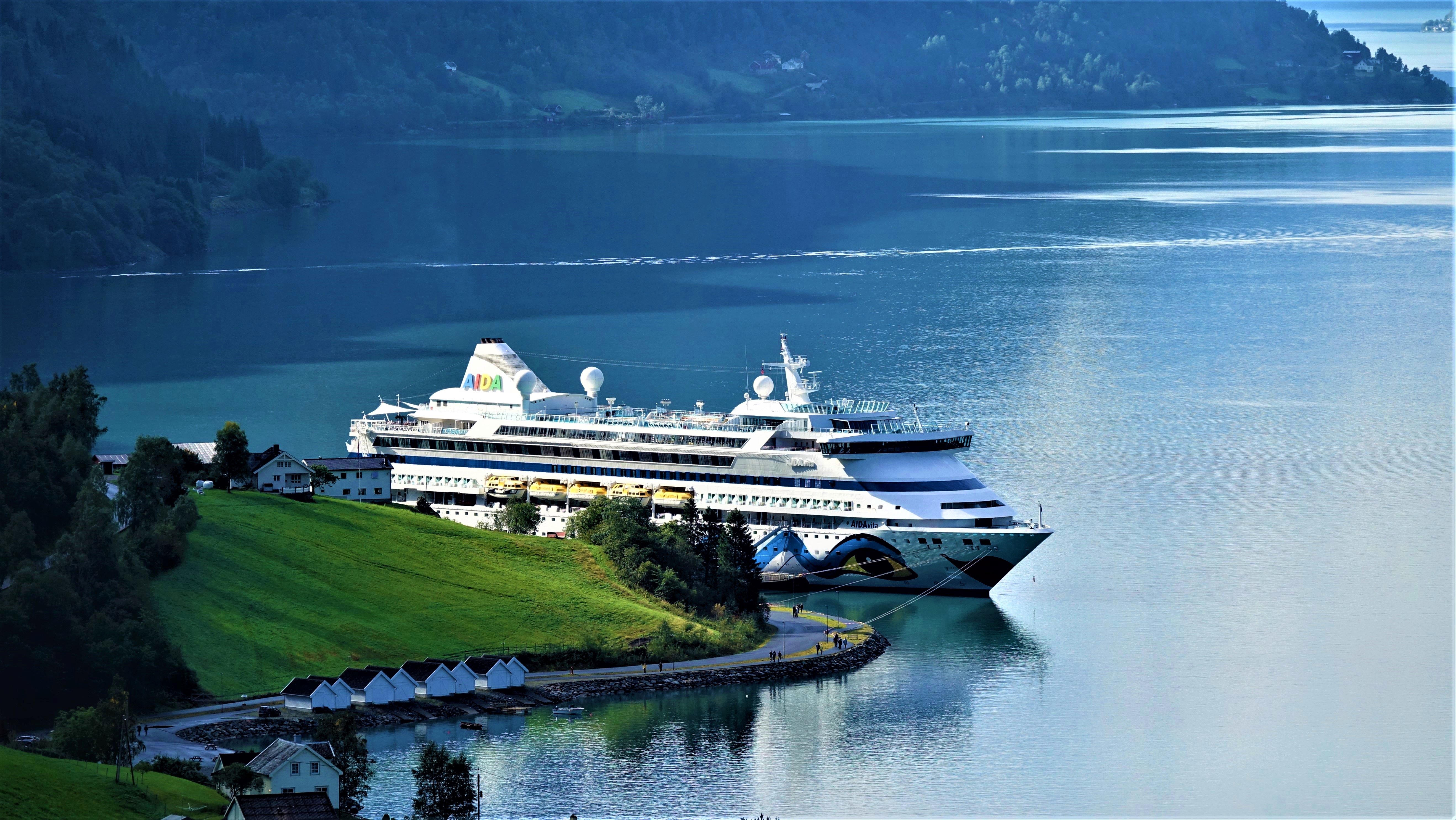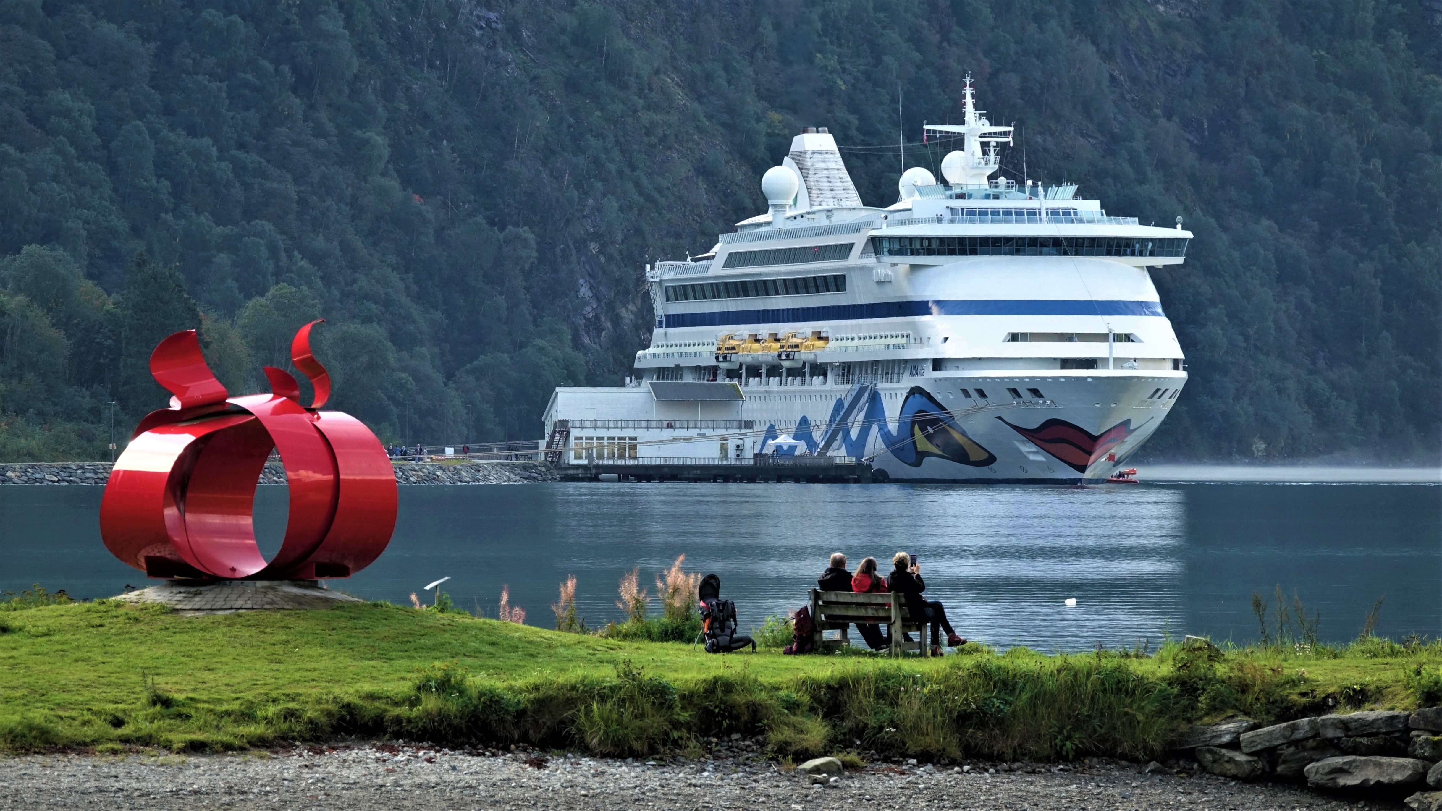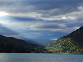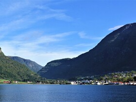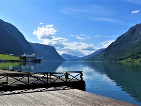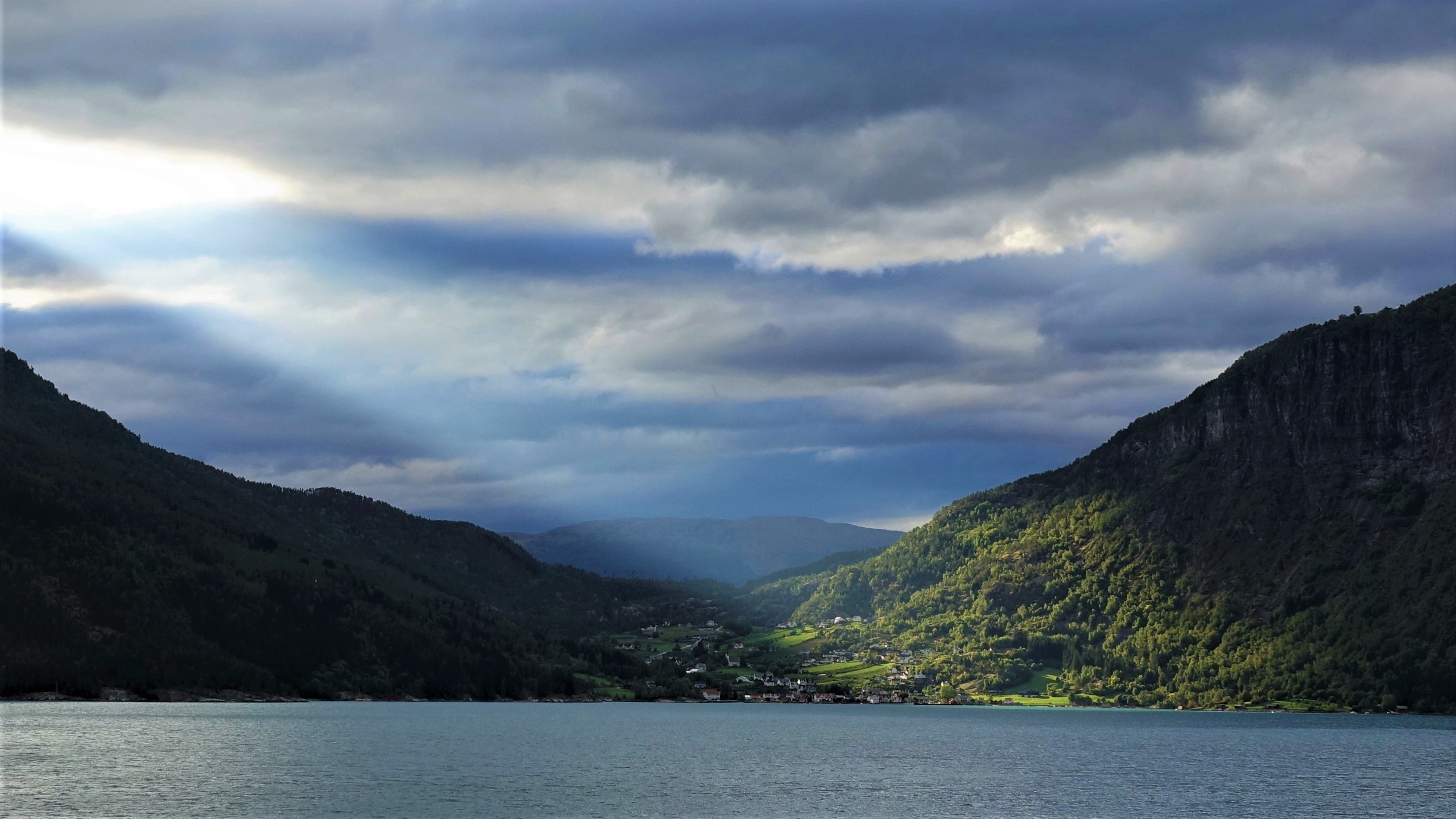 Als wir morgens an der etwas abseits liegenden Pier von Skjolden festgemacht haben, ist es wettertechnisch noch ziemlich zugezogen, so dass die ersten Fotos, die ich vom Balkon gemacht habe, das spätere Sortieren nicht überleben werden. Wenig später, nach dem Frühstück und kurz vor Verlassen des Schiffes, bietet sich uns vom Balkon dann dieser Blick auf den Ort.