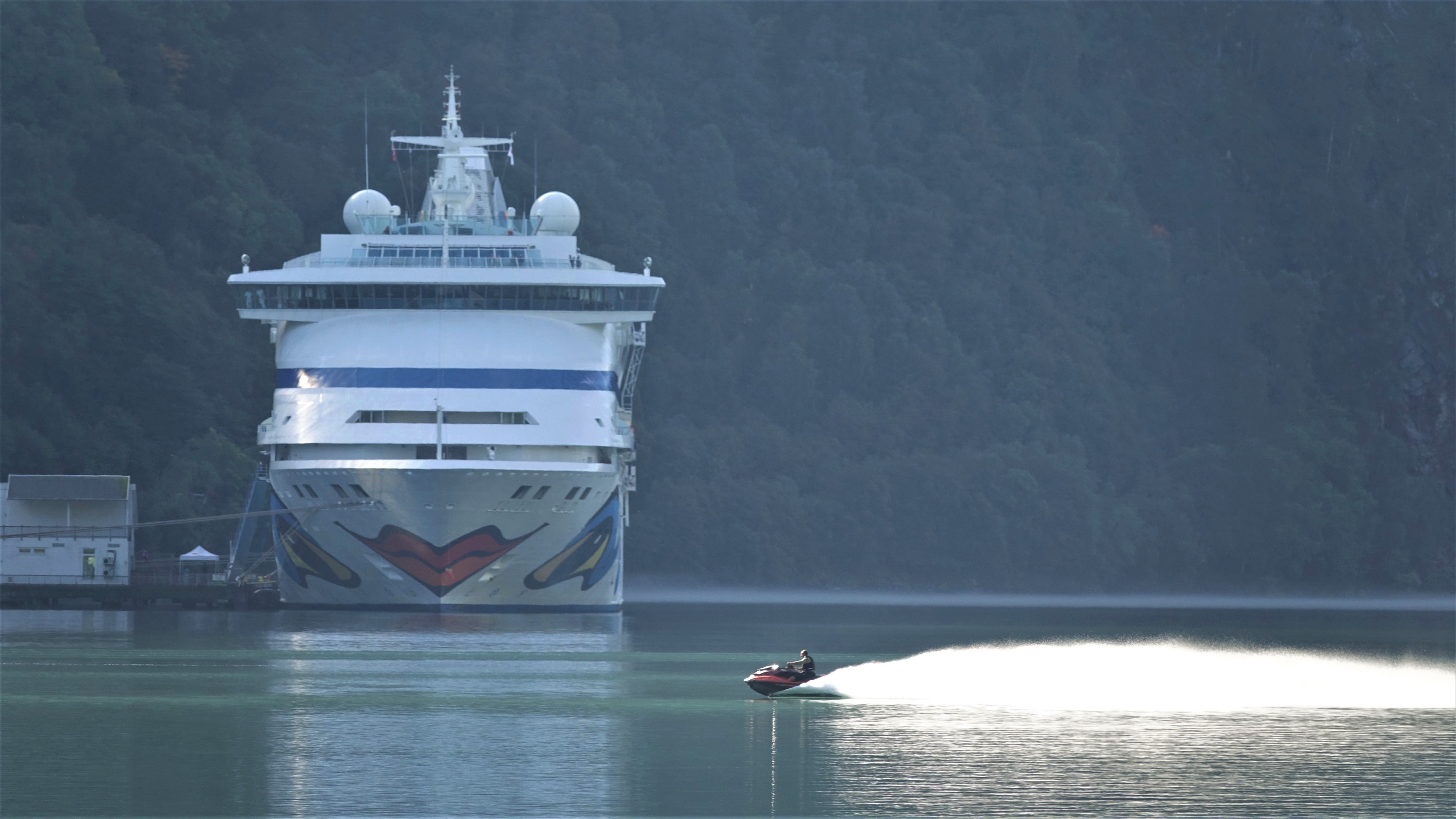 Beim Blick zurück sehen wir dann auch endlich den Jetskifahrer, den wir schon lange gehört haben. Es macht ihm sichtlich Spaß, an der AIDAvita vorbei zu düsen.