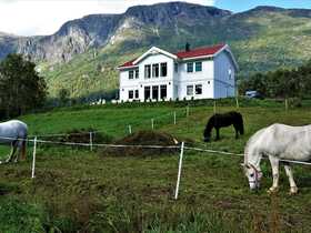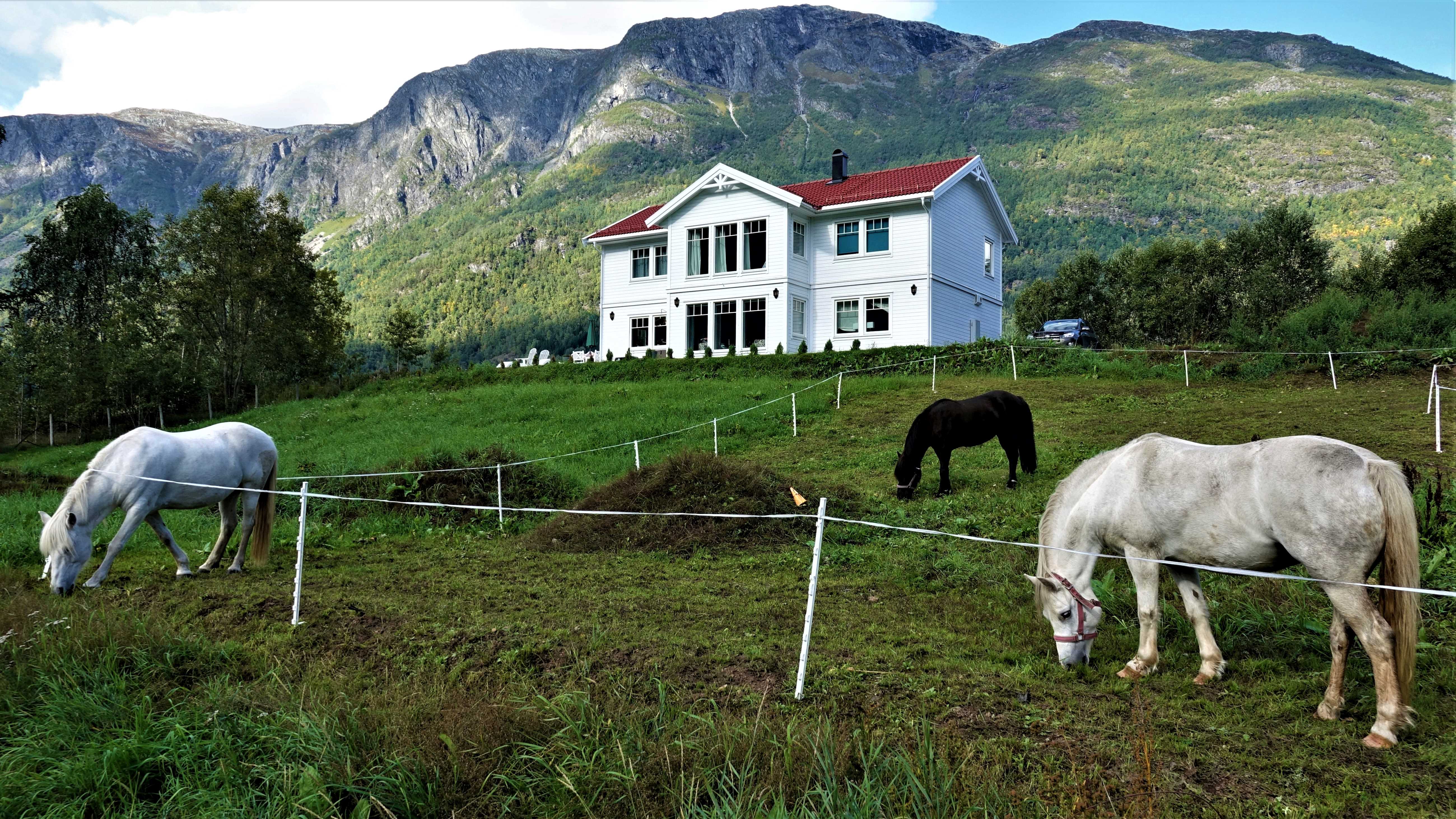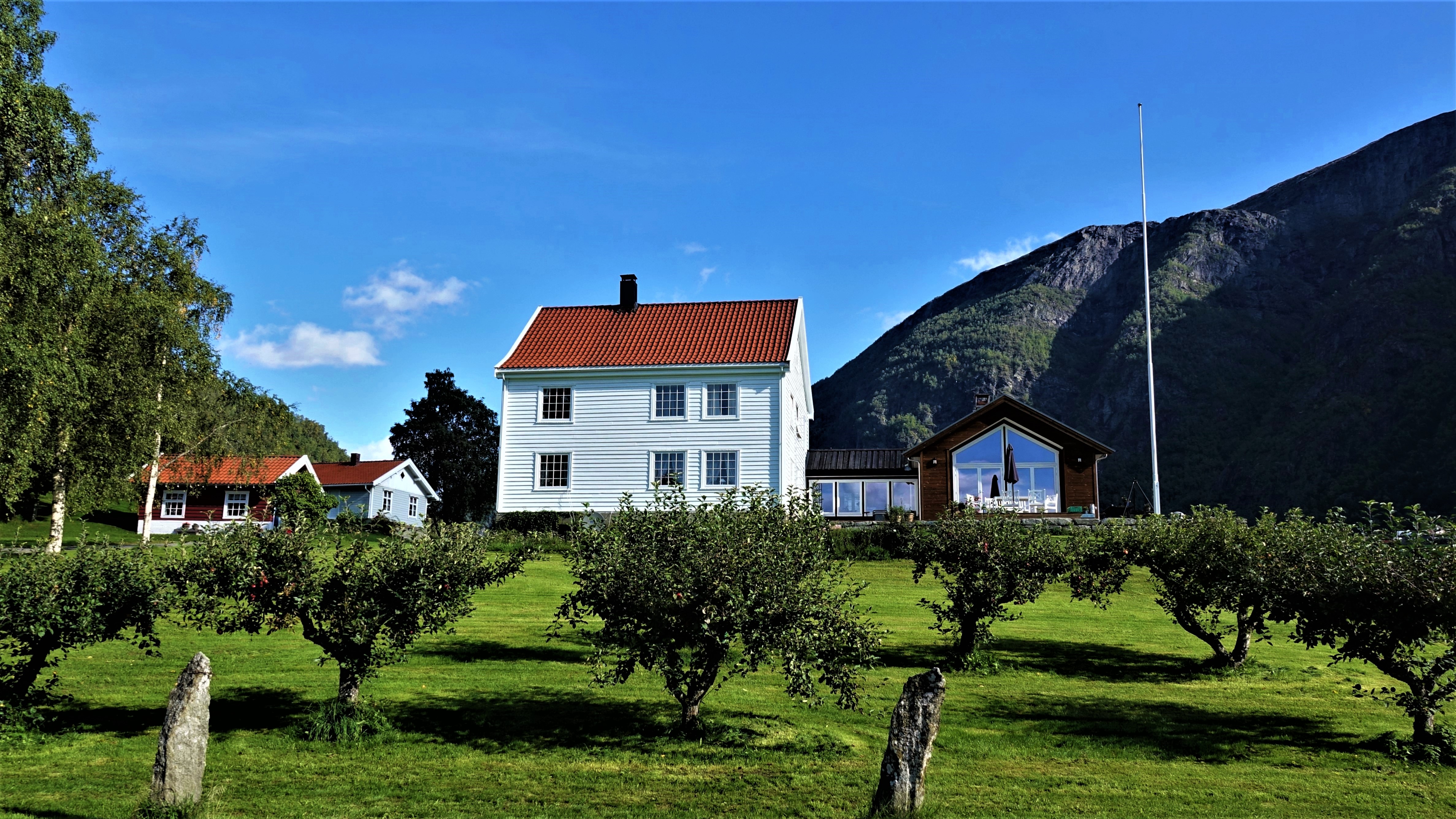 Am Sogneford wie auch am Hardangerfjord liegen Norwegens größte Obstanbaugebiete. So wundert es nicht, dass hier im Garten ein paar Apfelbäume stehen. In anderen Gärten grasen Pferde.