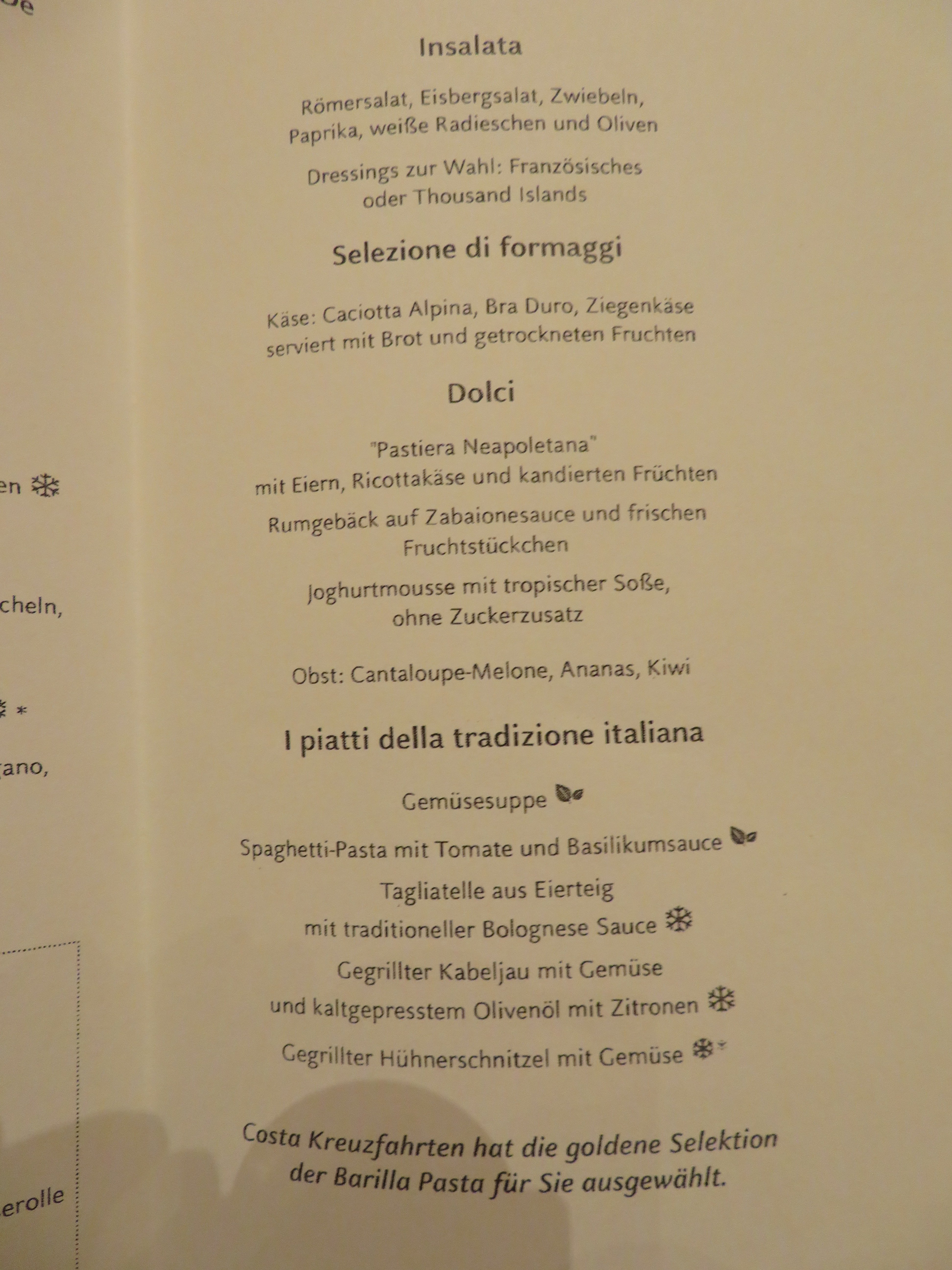 Zwischen 12.00 und 13.30 Uhr am Seetag gibt es ein italienisches Mittagessen. An Hafentagen ist es nur eine Stunde. Genutzt haben wie es nicht, deshalb kann ich hierzu nichts weiter sagen.