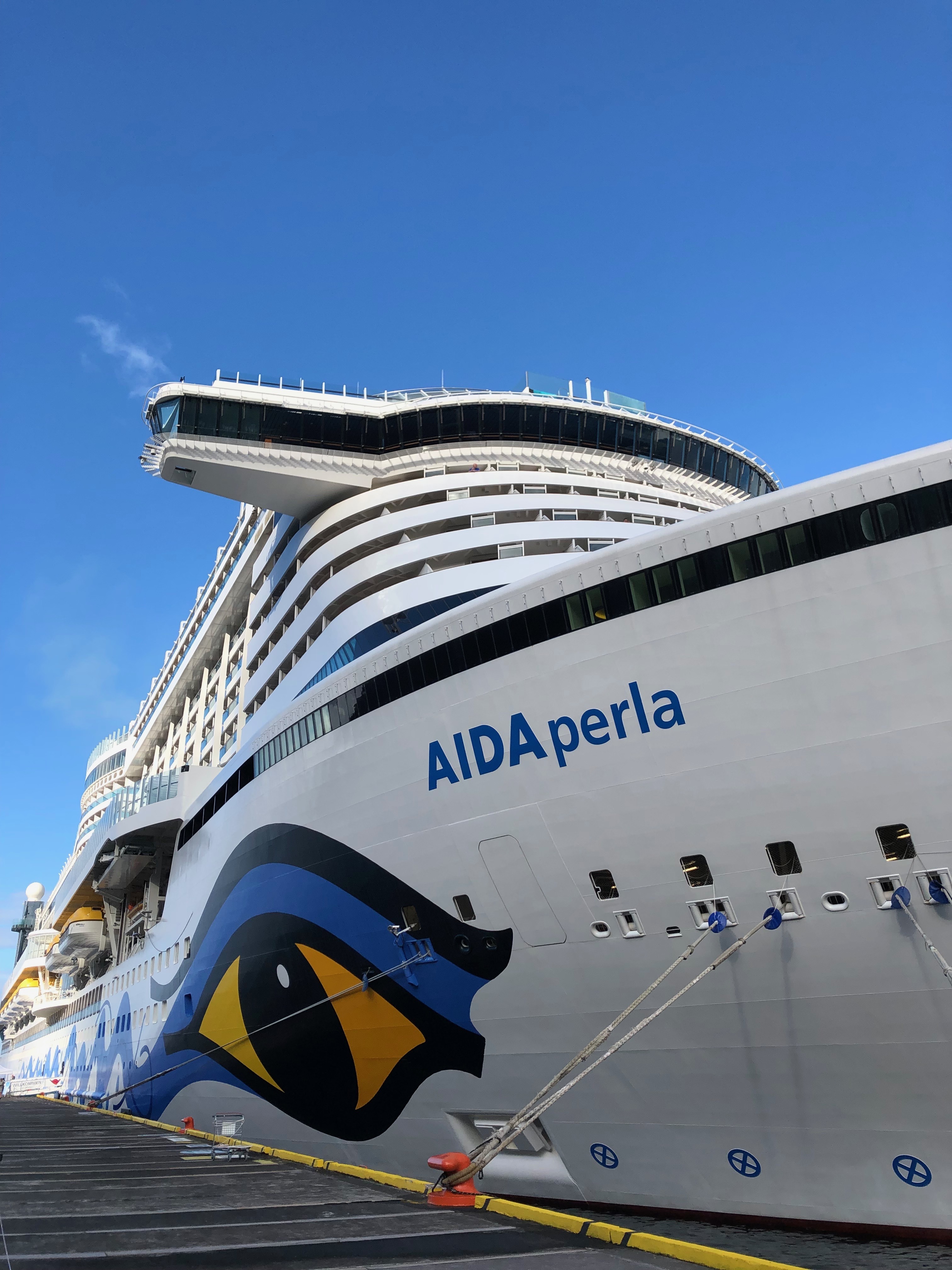 Aus dem kalten Winter in Deutschland kommend war es ein tolles Gefühl, bereits so früh am Morgen in Shorts und T-Shirt ohne jegliches frösteln einige Runden um das Deck zu schlendern… man muss zwar einmal von Deck 15 (Sonnendeck mit dem kleinen Außenpool und auf derselben Höhe wie der Beach Club) auf Deck 16 (auf Höhe des oberen Umlaufes des Beach Clubs) und von dort ein Stück weiter vorne hoch auf Deck 17 gehen, doch auch auf AIDAperla ist ein kompletter Rundgang über die oberen Decks im Außenbereich problemlos möglich. Zwar befindet sich direkt im Bugbereich auf Deck 16 das nicht frei zugängliche Patio-Deck, aber vom darüber liegenden Deck 17 kann man auch einen sehr schönen Blick nach vorne über den Bug hinaus werfen, wo man schon die Lichter von St. Vincent ausmachen konnte. Eine weitere tolle Sache ist der Skywalk im Heck, von dessen leicht ausgelagerten Position man einen tollen Blick entlang des Schiffes hat….