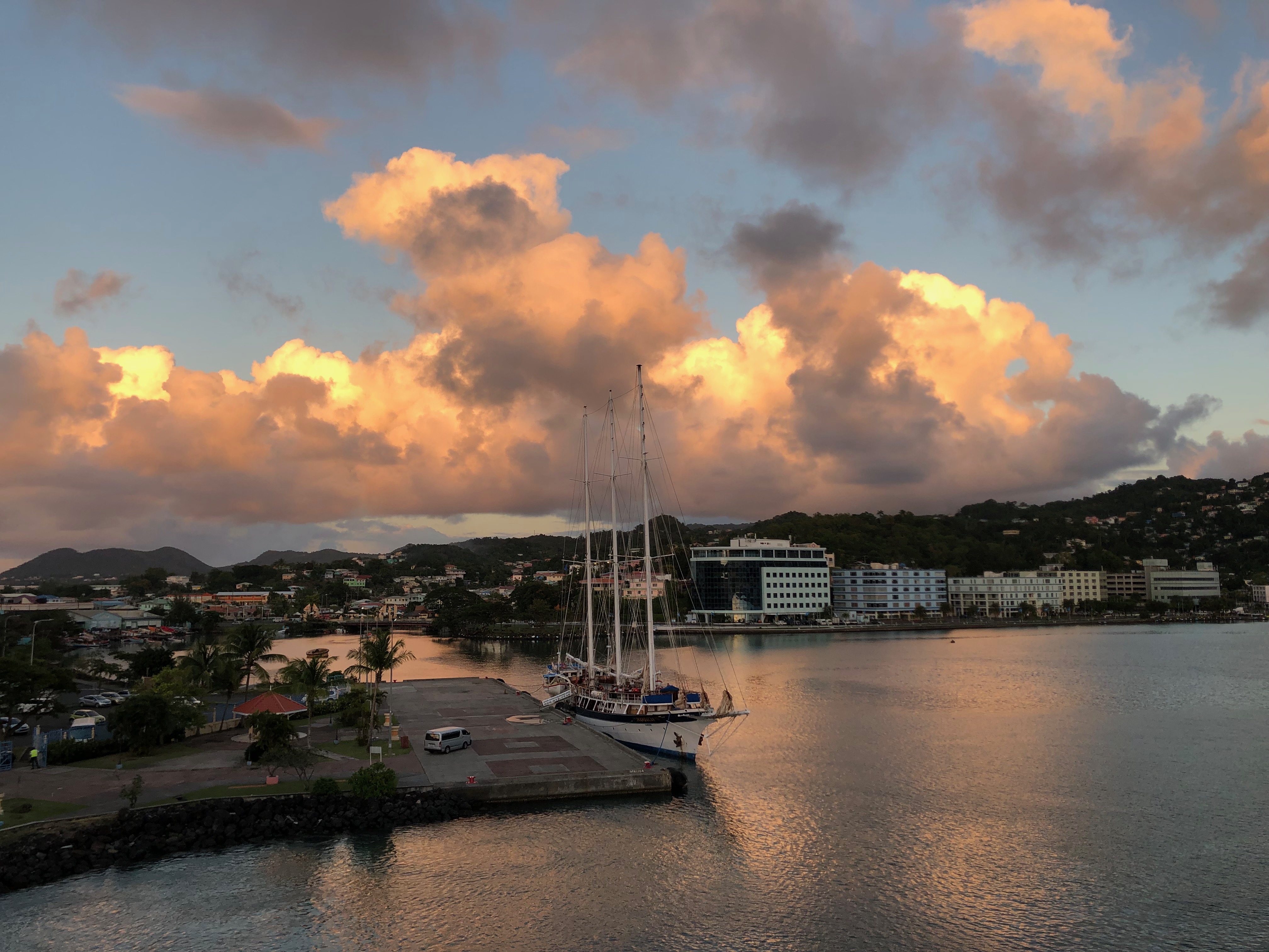 AIDAperla liegt heute Morgen in Castries auf St. Lucia. Kapitän Falk Bleckert hat sich am Abend zuvor für ein verfrühtes Einlaufen entschieden um nicht mit der ebenfalls im Hafen liegenden Norwegian Dawn zeitgleich einzulaufen.
