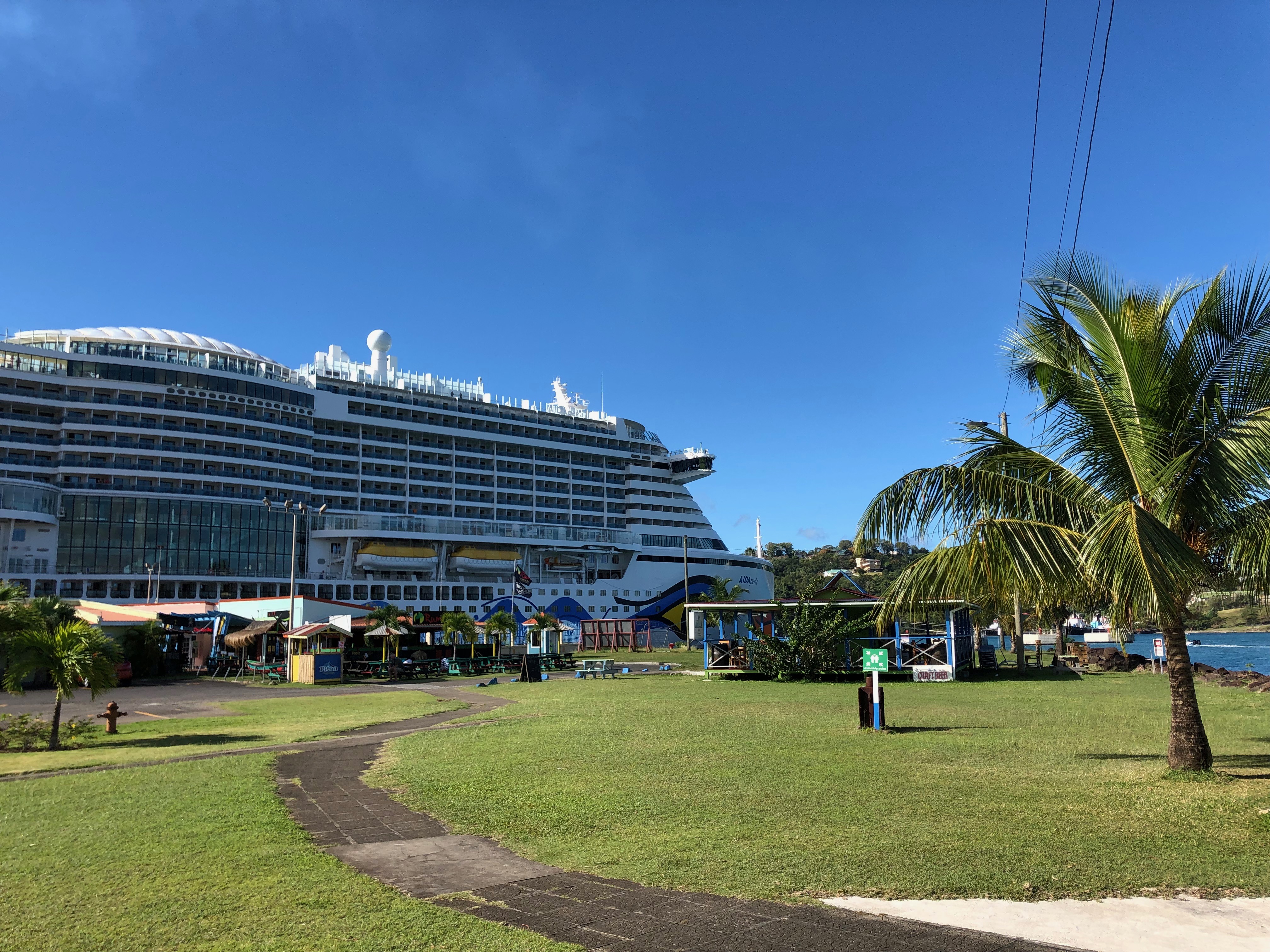 AIDAperla liegt heute am regulären Ausflugsterminal von Castries und nicht auf der anderen Seite des Hafenbeckens im Industriegebiet.
