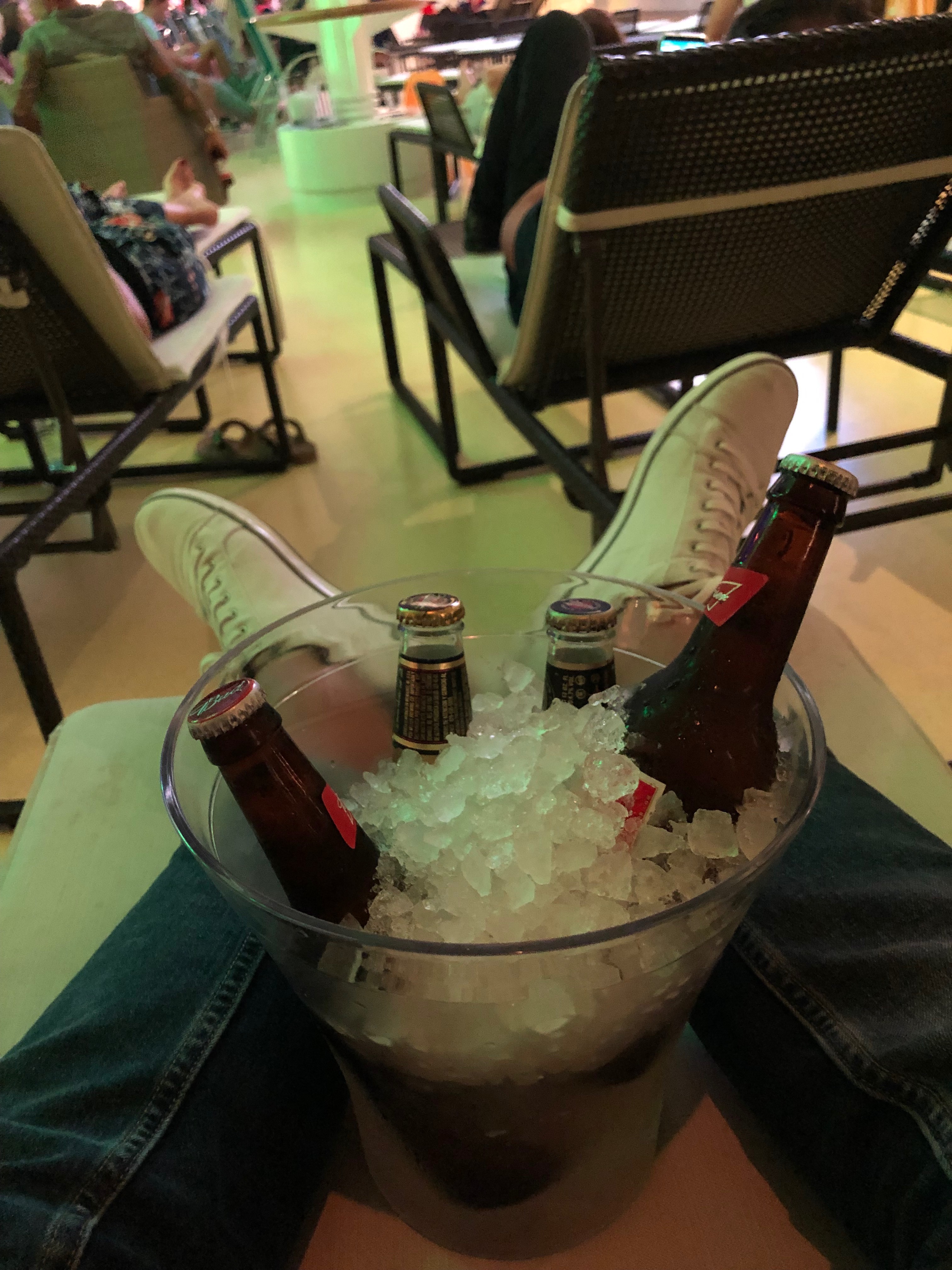 Anschließend begeben wir uns auf Deck 14 und haben Probleme, einen Platz zu finden. Der Andrang ist unerwartet hoch, es gibt eine Baraktion, bei der man ein „Beer-Bucket“ bekommt, vier amerikanische Biersorten im Eiskübel für 10,00 Euro, und die Stimmung ist wirklich gut.