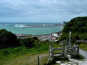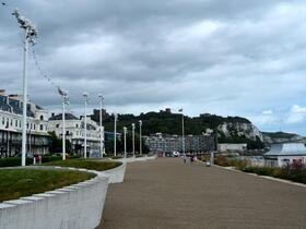 Ein Schmuckstück, das in Dover angelegt worden war. Neben der Durchgangsstraße ein breiter Fahrradweg, daneben viel Platz zum Flanieren. Direkt entlang des langen Sandstrands. Hinter uns der Fährhafen, in dem der Teufel los war. Ganz natürlich, denn Dover gilt als größter Fährhafen Großbritanniens. Eine einlaufende Fähre löste quasi die auslaufende ab. Der Hafen selbst wurde in den letzten Jahren ausgebaut. Eine weitflächige Marina wurde erstellt; unser Schiff lag an einem erst kürzlich fertig gestellten Kai. Und auf der Landseite? Einige schöne ältere Häuser; einige in Renovierungsstand. Und auch so etwas wie ein lang gesteckter Wohnblock, der an Plattenbauten erinnerte. Aber immerhin war er verklinkert. Doch irgendwie passte er nicht zur Strandnähe … Wir testeten eine parallel zu unserem AIDA-Kai verlaufende Fußgängermole, um einen Blick auf unser Schiff werfen zu können. Lang war sie … aber wir schafften sie nach den vielen Kilometern, die wir an diesem Tag zurückgelegt hatten. Später stellte sich heraus, dass wir insgesamt 14 km bewältigt hatten. Nicht schlecht … Auch der Blick in Richtung der Felsen und der Stadt hatte etwas.