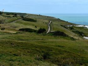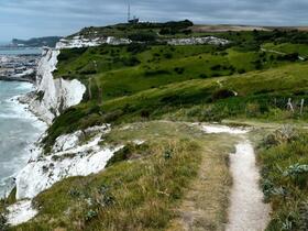 In der Nähe des Denkmals fragten wir eine Wanderin, ob vom Memorial aus der Weg Richtung Klippen frei wäre. Er war frei – gut, dass Passanten besser Bescheid wussten als Fremdenverkehrszöglinge … Also los, zunächst entlang einer auf und ab führenden Straße bis wir zur Zufahrt des Nationalparkzentrums gelangten. Unterwegs gab es immer wieder tolle Ausblicke auf Dover Castle –