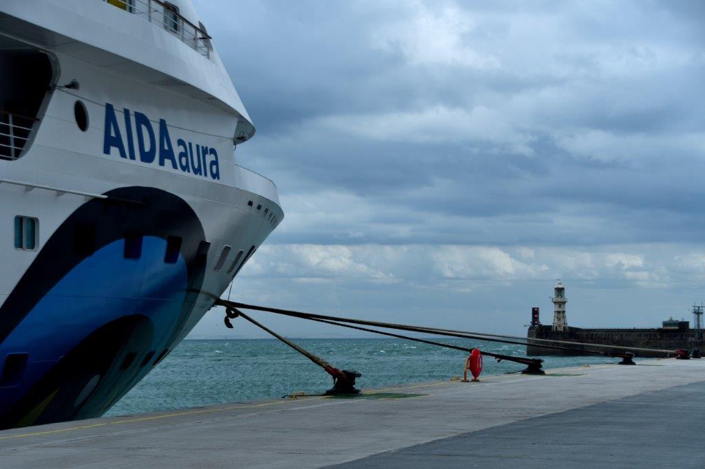 Logisch, dass wir zum Auslaufen auf Deck 10 standen. Es verzögerte sich. Gründe waren der sich weiter verstärkende Wind und eine Fähre, die Probleme hatte, bei Windstärke von annähernd 10 rückwärts einzuparken. Das schnelle Verlassen des Hafens durch die kurz vor unserem Bug liegende Wellenbrecherlücke konnte man vergessen. Der Landwind – besser Landsturm – hätte die AIDAaura bei der naturgemäß geringen Anfangsgeschwindigkeit gegen die Wellenbrecher drücken können. Also musste unser Schiff drehen und versuchen, durch den östlichen Hafenausgang zu gelangen. Aber auch das ging nicht ohne Hilfe: Zwei Schlepper sorgten mit ihren Bugkontakten, dass die AIDAaura nicht abtreiben konnte. Schlepper? Nein, eher Drücker.