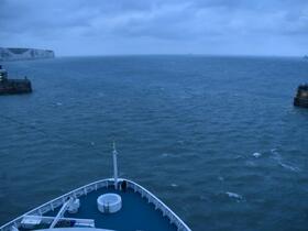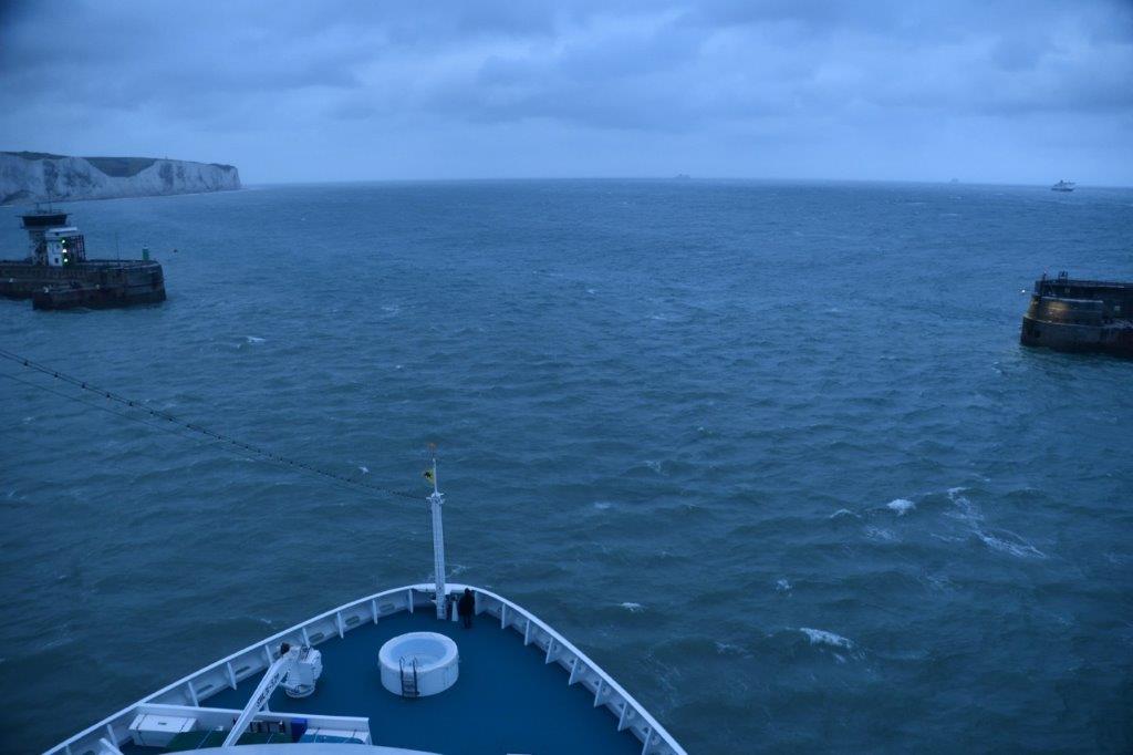 Das im Dunst liegende Dover lag schnell hinter uns. Wir machten eine Stippvisite beim englischen Essen im Calypso und planten einen Absacker in der Ohschän-Bar. Leider geschlossen. Auch der Außenbereich der Anytime-Bar hatte etwas gegen uns. Nur die Pool-Bar war als Außenbar geöffnet – sie lag im Sturmschatten … Vor der Rückkehr in unsere Kabine stellten wir fest, dass der Rundgang auf Deck 6 auf beiden Seiten geschlossen war. Das tangierte uns lediglich peripher – wir wollten in die Federn!