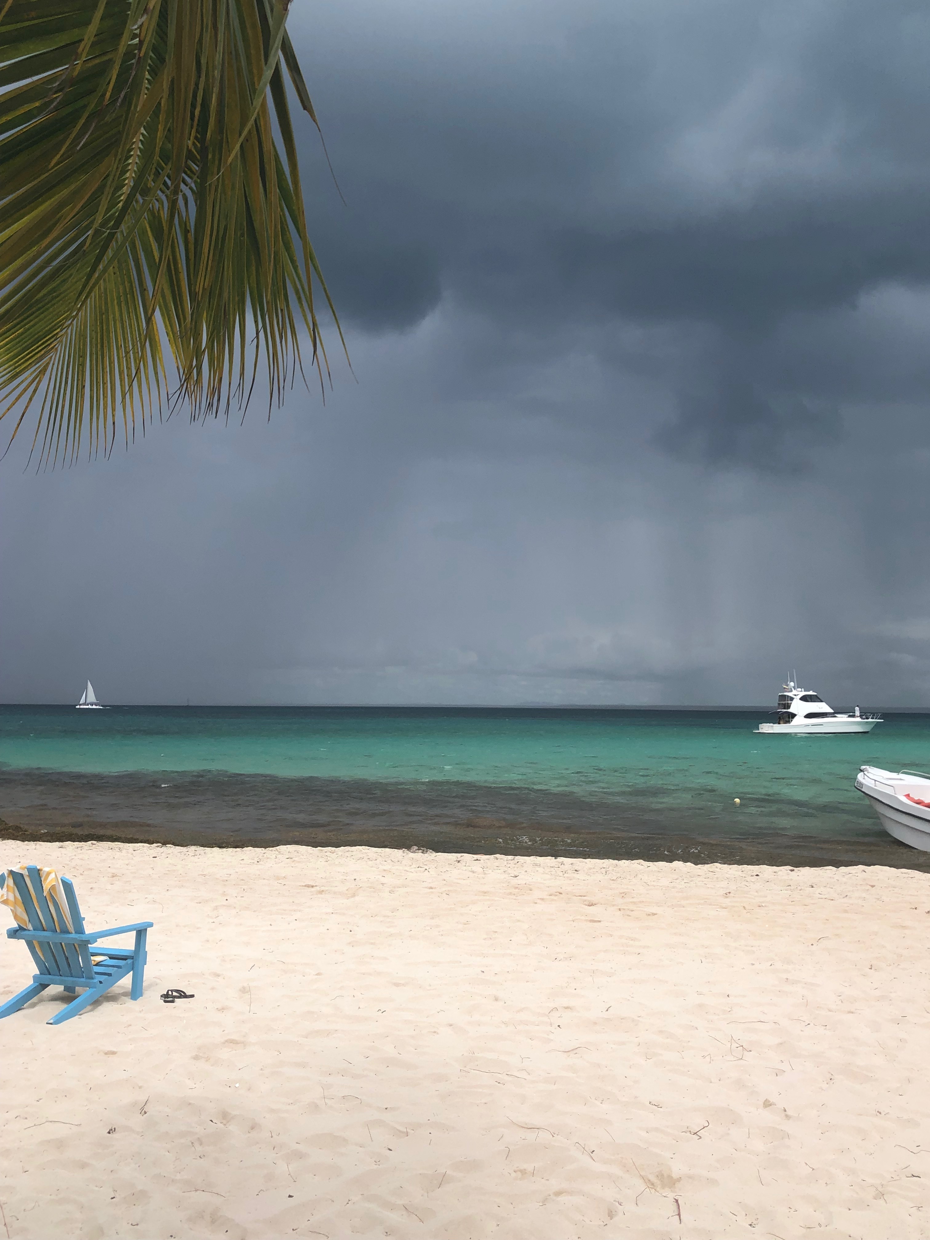 Während wir uns am Strand noch zumindest ein wenig in der Sonne aalen sehen wir auch, wo der aufkommende Wind seinen Ursprung hat. Über dem Wasser brauen sich dicke Wolken zusammen und man kann deutlich sehen, dass es nicht weit entfernt über den dort