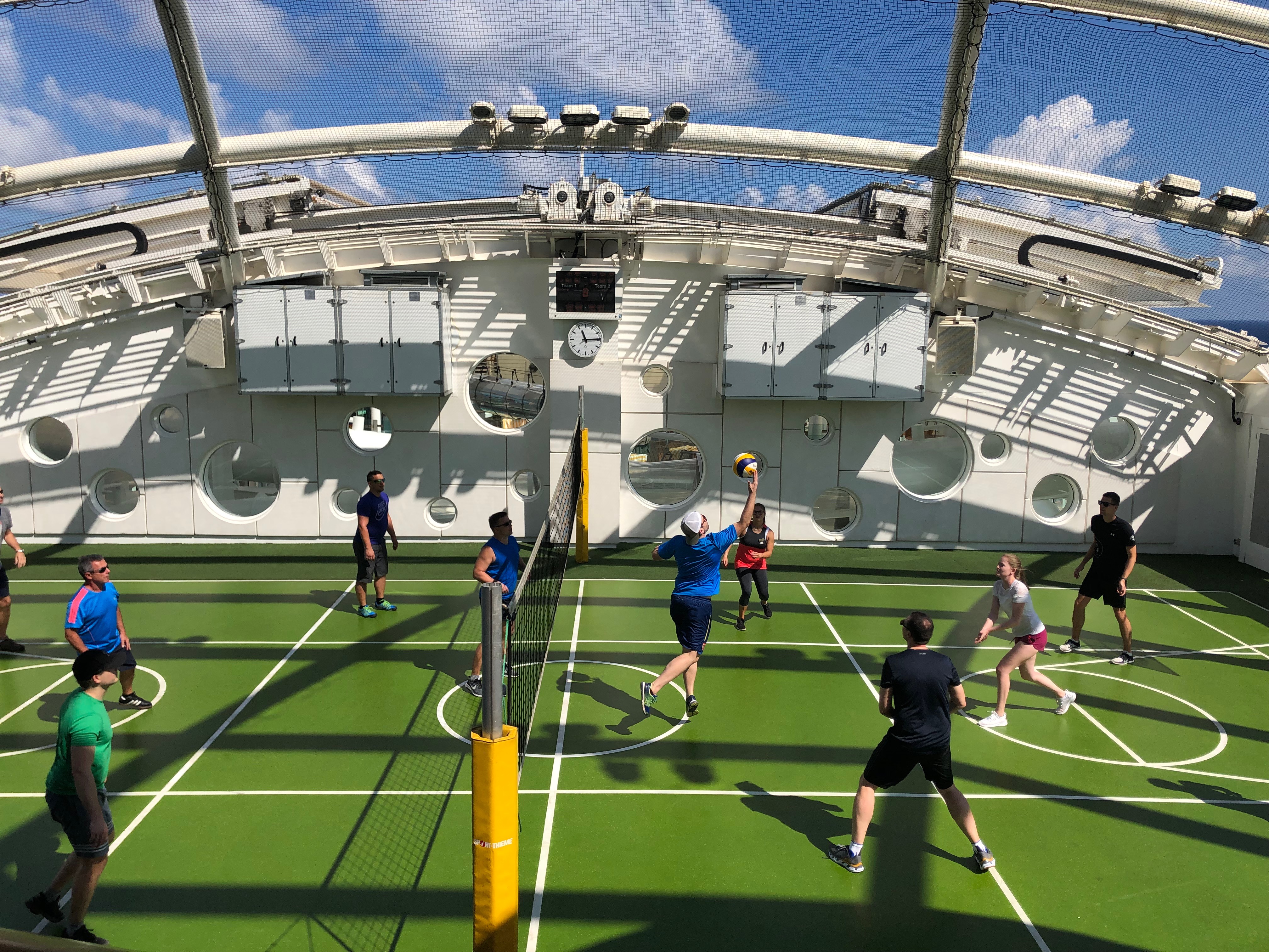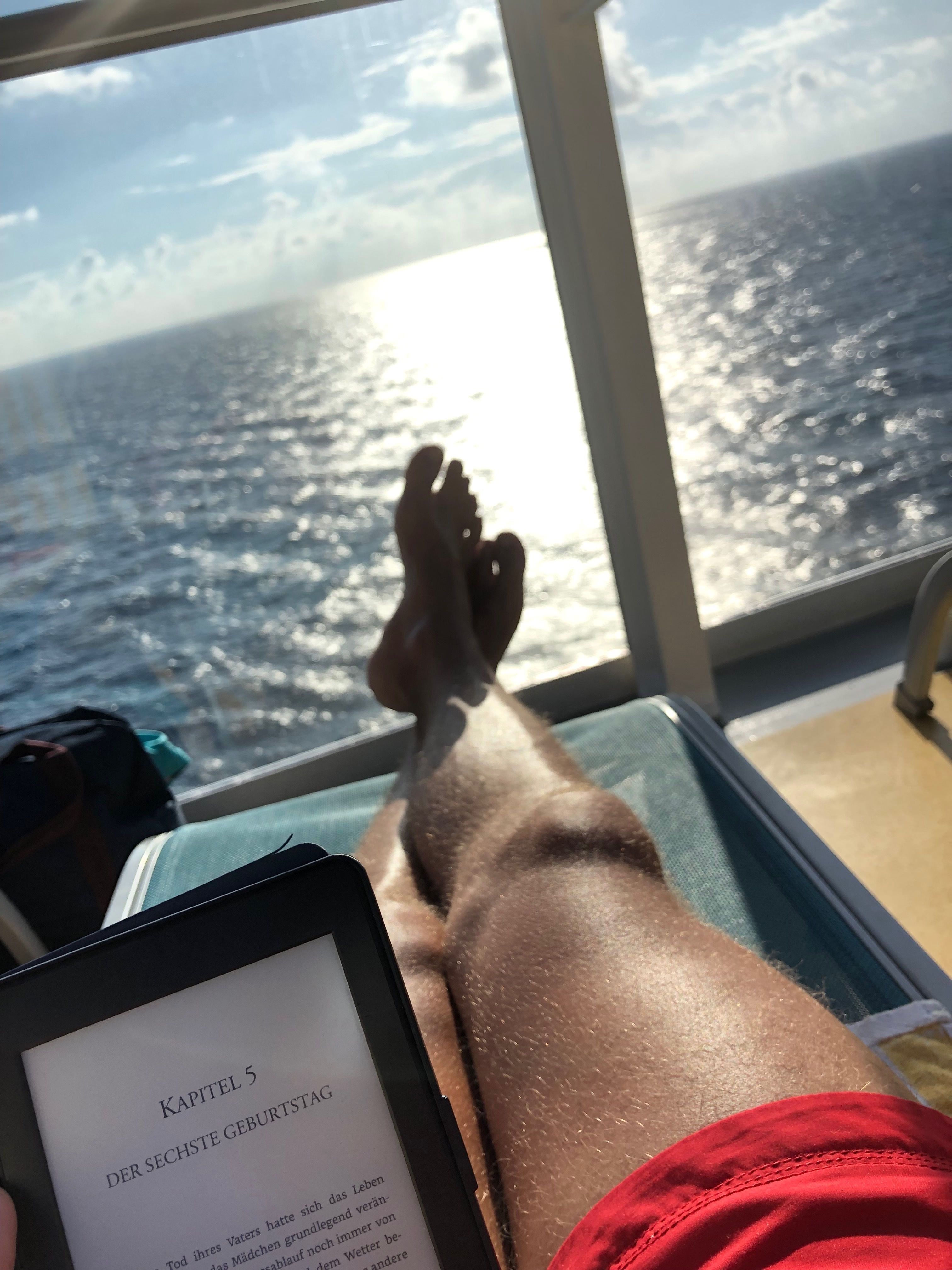 Nach einem entspannten Frühstück auf der Außenterrasse des „Weite Welt“-Restaurants suchen wir uns einen Platz an der Sonne, diesmal wieder auf Deck 16 und verbringen die Zeit mit Lesen, Dösen, kurzen Runden über das Deck, einer kleinen Abkühlung im Pool oder mit einem kurzen Gang zur Bar… Zwischenzeitlich gehe ich für eine Runde Volleyball auf das Sportaußendeck, macht wieder einmal Spaß!