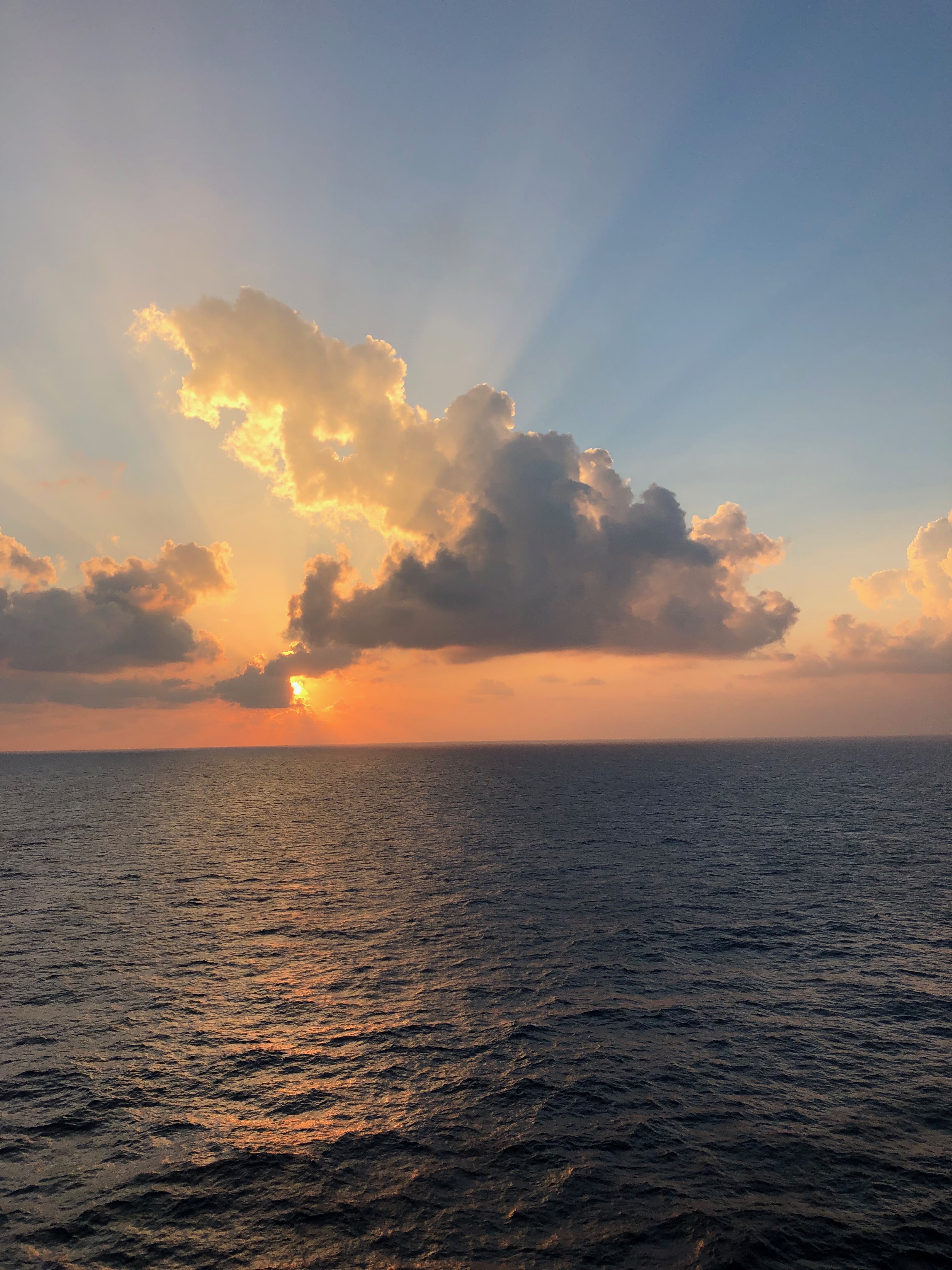 …es ist früh morgens, Seetag, wir stehen vorne auf Deck 17, trinken den ersten Kaffee des Tages und genießen die Aussicht! Ein paar Schönwetterwolken hängen am Himmel, als die Sonne aufgeht, ansonsten ist ringsherum nur das karibische Meer zu sehen.